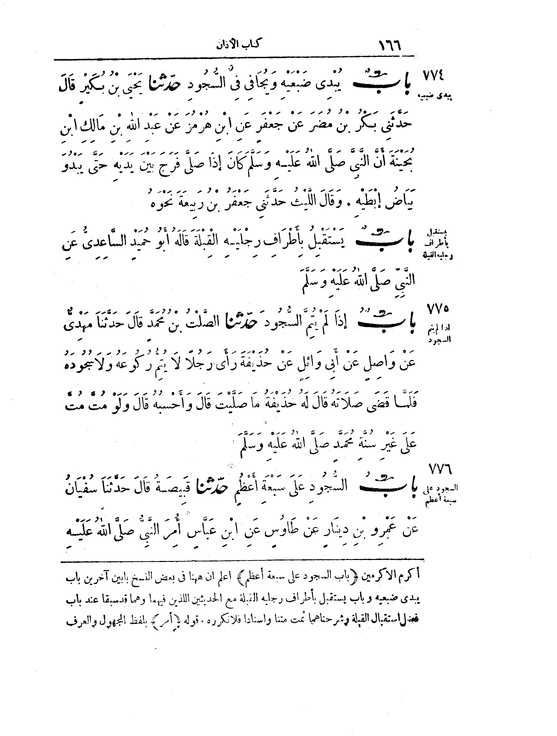 أكرم الأكرمين (باب السجود على سبعة أعظم) اعلم أن هنا في بعض النسخ بابين آخرين باب يبدي ضبعيه وباب يستقبل بأطراف رجليه القبلة مع الحديثين اللذين فيهما وهما قد سبقا عند باب فضل استقبال القبلة وشرحناهما ثمّت متنا وإسنادا فلا نكرره. قوله (آمر) بلفظ المجهول والعرف
