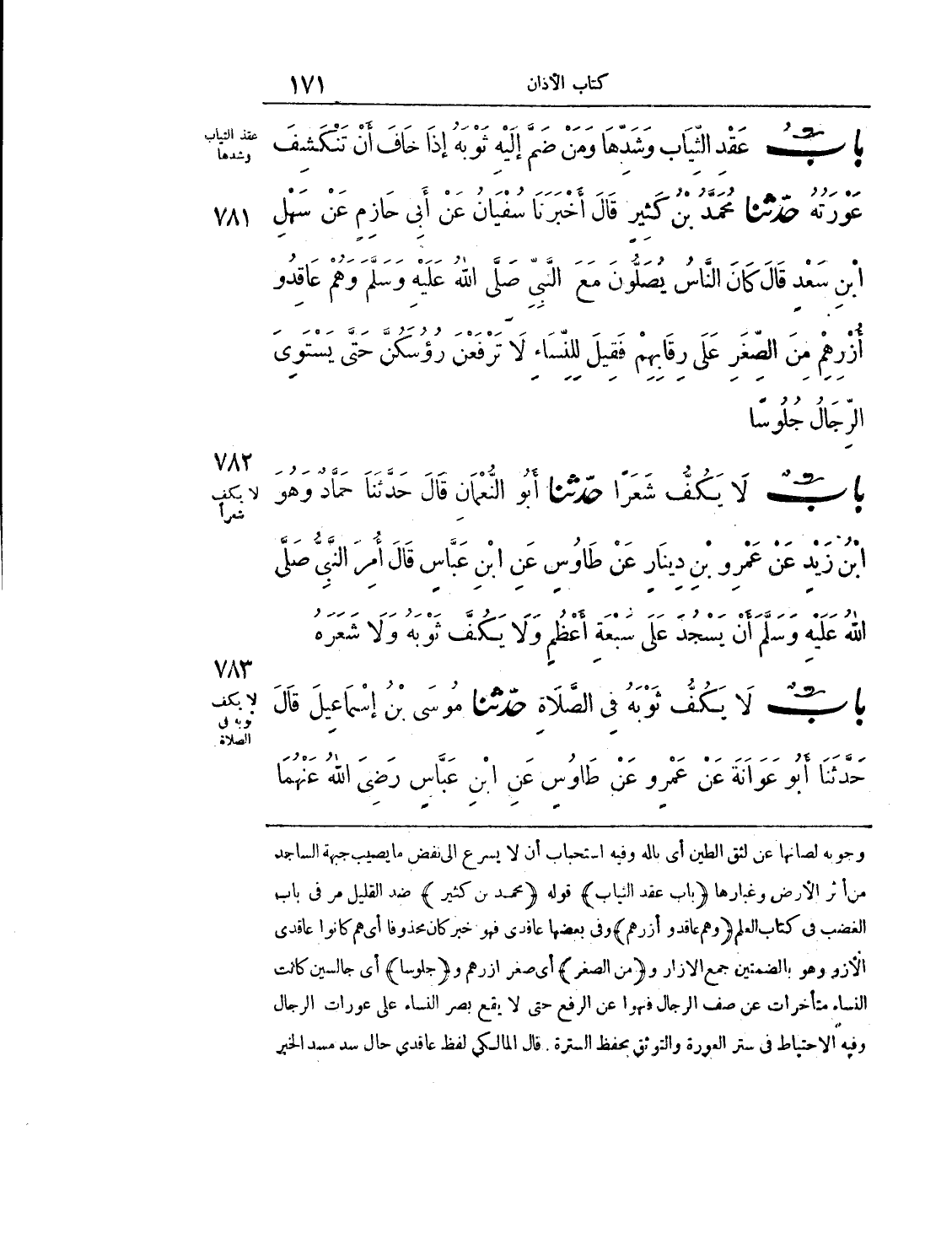 وجوبه لصانها عن لثق الطين أي باله وفيه استحباب أن لا يسرع إلى نقض ما يصيب جبهة الساجد من أثر الأرض وغبارها (باب عقد الثياب) قوله (محمد بن كثير) ضد القليل من باب الغضب في كتاب العلم (وهم عاقدو أزرهم) وفي بعضها عاقدي فهو خير كان محذوفا أي هم كانوا عاقدي الأزر وهو بالضمتين جمع الإزار و (من الصغر) أي صغر أزرهم و (جلوسا) أي جالسين كانت النساء متأخرات عن صف الرجال فنهوا عن الرفع حتى لا يقع بصر النساء على عورات الرجال وفيه الاحتياط في ستر العورة والتوثق بحفظ السترة. قال المالكي لفظ عاقدي حال سدّ مسدّ الخير