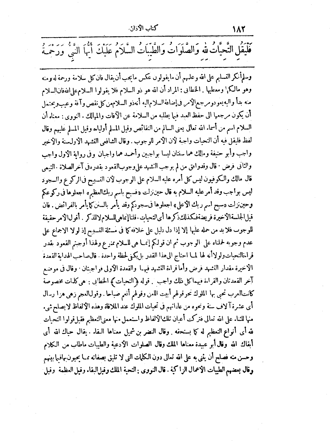 وسلم أنكر التسليم على الله وعليهم إن ما يقولون عكس ما يجب أن يقال فان كل سلامة ورحمة له ومنه وهو مالكها ومعطيها. الخطابي: المراد أن الله هو ذو السلام فلا يقولوا السلام على الله فان السلام منه بدأ واليه يعودو مرجع الأمر في إضافة السلام إليه أنه ذو السلام من كل نقص وآفة وعيب ويحتمل أن يكون مرجعها إلى حفظ العبد فيما يطلبه من السلامة عن الآفات والمهالك. النووي: معناه أن السلام اسم من أسماء الله تعالى يعني السالم من النقائص وقيل المسلم أولياءه وقيل المسلم عليهم وقال السلام اسم من أسماء الله تعالى يعني السالم من النقائص وقيل المسلم أولياءه وقيل المسلم عليهم وقال لفظ فليقل فيه أن التحيات واجبة لأن الأمر للوجوب. وقال الشافعي التشهد الأول سنة والأخير واجب وأبو حنيفة ومالك هما سنتان ليسا بواجبين وأحمد هما واجبان وفي رواية الأول واجب والثاني فرض. قال وقد وافق من لم يوجب التشهد على وجوب القعود بقدره في آخر الصلاة. التيمي قال مالك والكوفيون ليس كل أمره عليه السلام على الوجوب لأن التسبيح في الركوع والسجود ليس بواجب وقد أمر عليه السلام به قال حين نزلت {فسبح باسم ربك العظيم} اجعلوها في ركوعكم وحين نزلت {سبح اسم ربك الأعلى} اجعلوها في سجودكم وقد يأمر بالسنن كما يأمر بالفرائض فان قيل الجلسة الأخيرة فريضة فكذلك ذكرها أي التحيات. قلنا إنما هي للسلام لا للذكر. أقول الأمر حقيقة للوجوب فلا بد من حمله عليها إلا إذا دل دليل على خلافه كما في مسئلة التسبيح إذ لولا الإجماع على عدم وجوبه لحملناه على الوجوب ثم انا قولكم إنما هي للسلام ممنوع ولهذا أوجبتم القعود بقدر قراءة التحيات ولولا انه لها لما احتاج إلى هذا القدر بل يكفى لحظة واحدة. قال صاحب الهداية القعدة الأخيرة مقدار التشهد فرض وأما قراءة التشهد فيها والقعدة الأولى فواجبتان. وقال في موضع آخر القعدتان والقراءة فيهما كل ذلك واجب. قوله (التحيات) الخطابي: هي كلمات مخصوصة كانت العرب تحي بها الملوك نحو قولهم أبيت اللعن وقولهم أنعم صباحا. وقول العجم زهى هزا رسال أي عشرة آلاف سنة ونحوه من عاناتهم في تحيات الملوك عند الملاقاة وهذه الألفاظ لا يصلح شئ منها للثناء على الله تعالى فتركت أعيان تلك الألفاظ واستعمل منها معنى التعظيم فقيل قولوا التحيات لله أي أنواع التعظيم له كما يستحقه. وقال النضر بن شميل معناها البقاء. ويقال حياك الله أي أبقاك الله وقال أبو عبيدة معناها الملك وقال الصلوات الأدعية والطيبات ما طاب من الكلام وحسن منه فصلح أن يثنى به على الله تعالى دون الكلمات التي لا تليق بصفاته مما يحيون بما فيما بينهم وقال بعضهم الطيبات الأعمال الزاكية. قال النووي: التحية الملك وقيل البقاء وقيل العظمة وقيل
