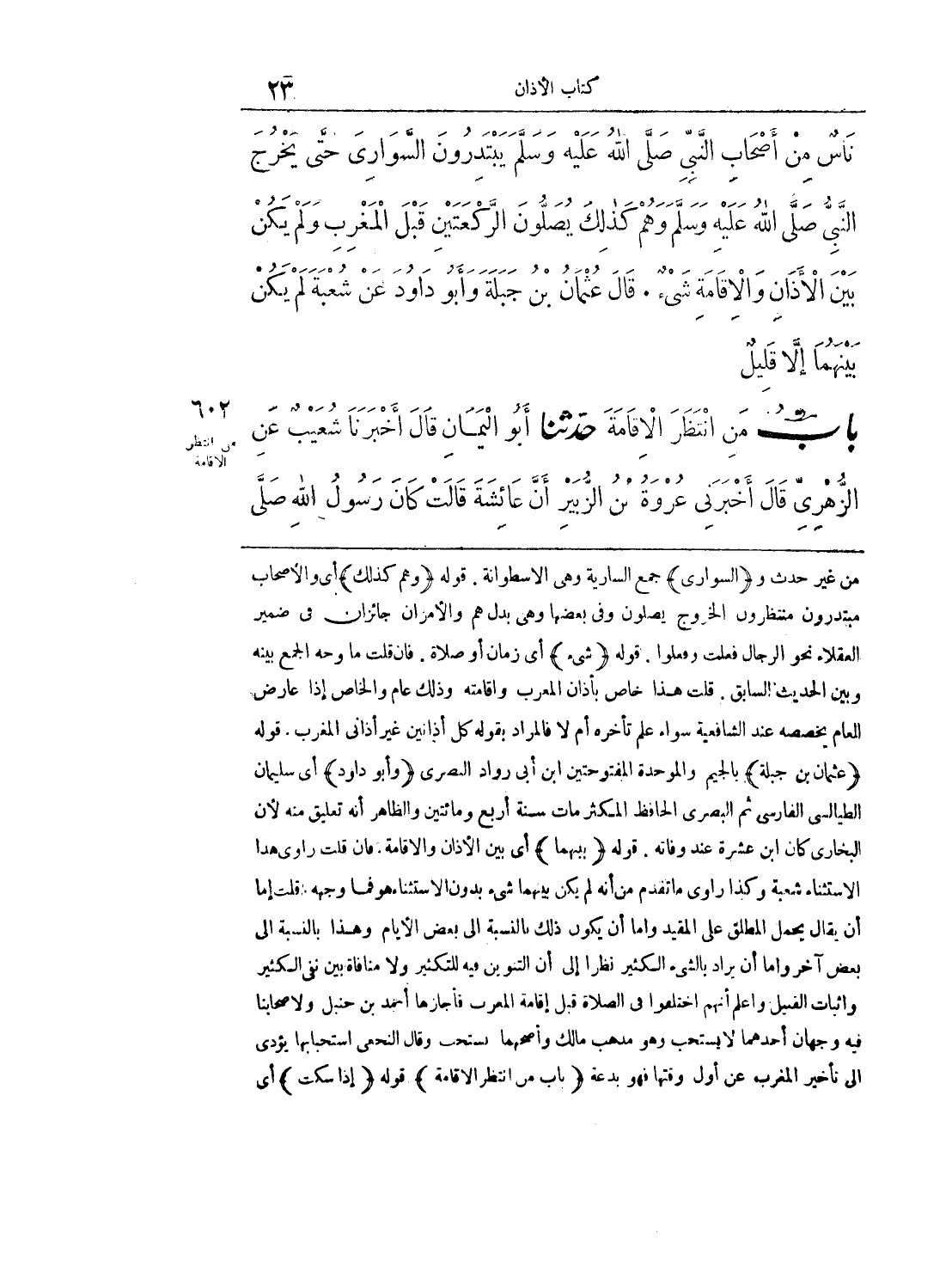 من غير حدث و (السواري) جمع السارية وهي الاسطوانة. قوله (وهم كذلك) أي والأصحاب مبتدرون منتظرون الخروج يصلون وفي بعضها وهي بدل هم والأمران جائزان في ضمير العقلاء نحو الرجال فعلت وفعلوا. قوله (شيء) أي زمان أو صلاة. فإن قلت ما وجه الجمع بينه وبين الحديث السابق. قلت هذا خاص بأذان المغرب وإقامته وذلك عام والخاص إذا عارض العام يخصصه عند الشافعية سواء علم تأخره أم لا فالمراد بقوله كل أذانين غير أذاني المغرب. قوله (عثمان بن جبلة) بالجيم والموحدة المفتوحتين ابن أبي رواد البصري (وأبو داود) أي سليمان الطيالسي الفارسي ثم البصري الحافظ المكثر مات سنة أربع ومائتين والظاهر أنه تعليق منه لأن البخاري كان ابن عشرة عند وفاته. قوله (بينهما) أي بين الأذان والإقامة، فإن قلت راوي هذا الاستثناء شعبة وكذا راوي ما تقدم من أنه لم يكن بينهما شيء بدون الاستثناء هو فما وجهه، قلت إما أن يقال يحمل المطلق على المقيد وأما أن يكون ذلك بالنسبة إلى بعض الأيام وهذا بالنسبة على بعض آخر وأما أن يراد بالشيء الكثير نظراً إلى أن التنوين فيه للتكثير ولا منافاة بين نفي الكثير وإثبات القليل، واعلم أنهم اختلفوا في الصلاة قبل إقامة المعرب فأجازها أحمد بن حنبل ولأصحابنا فيه وجهان أحدهما لا يستحب وهو مذهب مالك وأصحهما يستحب وقال النجعي استحبابها يؤدي إلى تأخير المغرب عن أول وقتها فهو بدعة (باب من انتظر الإقامة) قوله (إذا سكت) أي