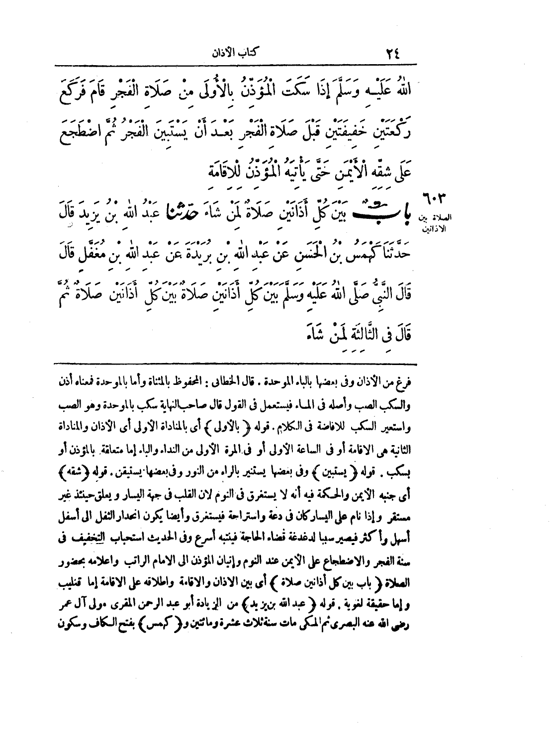 فرغ من الأذان وفي بعضها بالباء الموحدة. قال الخطابي: المحفوظ بالمثناة وأما بالموحدة فمعناه أذن والسكب الصب وأصله في الماء فيستعمل في القول قال صاحب النهاية سكب بالموحدة وهو الصب واستعير السكب للإفاضة في الكلام. قوله (بالأولى) أي بالمناداة الأولى أي الأذان والمناداة الثانية هي الإقامة أو في الساعة الأولى أو في المرة الأولى من النداء والباء إما متعاقة. بالمؤذن وبسكب. قوله (يستبين) وفي بعضها يستنير بالراء من النور وفي بعضها يستيقن، قوله (شقه) أي جنبه الأيمن والحكمة فيه أنه لا يستغرق في النوم لأن القلب في جهة اليسار ويعلق حينئذ غير مستقر وإذا نام على اليسار كان في دعة واستراحة فيستغرق وأيضاً يكون انحدار الثفل إلى أسفل أسهل وأكثر فيصير سبباً لدغدغة قضاء الحاجة فينتبه أسرع وفي الحديث استحباب التخفيف في سنة الفجر والاضطجاع على الأيمن عند النوم وإتيان المؤذن إلى الإمام الراتب وإعلامه بحضور الصلاة (باب بين كل أذانين صلاة) أي بين الأذان والإقامة وإطلاقه على الإقامة إما قنليب وإما حقيقة لغوية، قوله (عبد الله بن يزيد) من الزيادة أبو عبد الرحمن المقري مولى آل عمر رضي الله عنه البصري ثم المكي مات سنة ثلاث عشرة ومائتين و (كهمس) بفتح الكاف وسكون