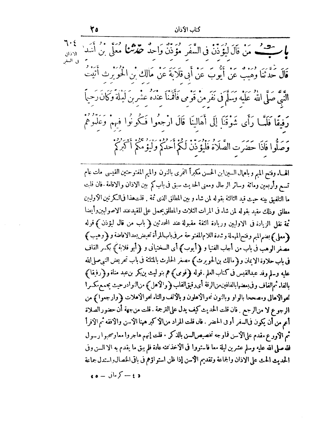 604 - حَدَّثنا مُعَلَّى بْنُ أَسَدٍ، قَالَ: حَدَّثنا وُهَيْبٌ، عَنْ أَيُّوبَ، عَنْ أَبِي قِلاَبَةَ، عَنْ مَالِكِ بْنِ الحُوَيْرِثِ، أَتَيْتُ النَّبِيَّ صَلى الله عَلَيهِ وسَلمَ فِي نَفَرٍ مِنْ قَوْمِي، فَأَقَمْنَا عِنْدَهُ عِشْرِينَ لَيْلَةً، وَكَانَ رَحِيمًا رَفِيقًا، فَلَمَّا رَأَى شَوْقَنَا إِلَى أَهَالِينَا، قَالَ: ارْجِعُوا فَكُونُوا فِيهِمْ، وَعَلِّمُوهُمْ، وَصَلُّوا، فَإِذَا حَضَرَتِ الصَّلاَةُ، فَلْيُؤَذِّنْ لَكُمْ أَحَدُكُمْ، وَلْيَؤُمَّكُمْ أَكْبَرُكُمْ.