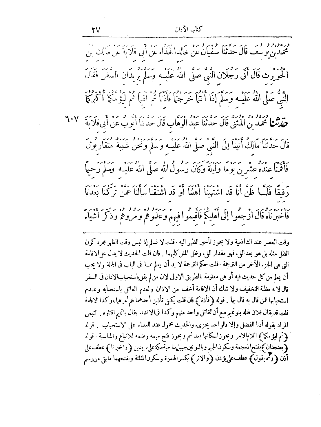 607 - حَدَّثنا مُحَمَّدُ بْنُ المُثَنَّى، قَالَ: حَدَّثنا عَبْدُ الوَهَّابِ، قَالَ: حَدَّثنا أَيُّوبُ، عَنْ أَبِي قِلاَبَةَ، قَالَ: حَدَّثنا مَالِكٌ، أَتَيْنَا إِلَى النَّبِيِّ صَلى الله عَلَيهِ وسَلمَ وَنَحْنُ شَبَبَةٌ مُتَقَارِبُونَ، فَأَقَمْنَا عِنْدَهُ عِشْرِينَ يَوْمًا وَلَيْلَةً، وَكَانَ رَسُولُ اللهِ صَلى الله عَلَيهِ وسَلمَ رَحِيمًا رَفِيقًا، فَلَمَّا ظَنَّ أَنَّا قَدِ اشْتَهَيْنَا أَهْلَنَا، أَوْ قَدِ اشْتَقْنَا، سَأَلَنَا عَمَّنْ تَرَكْنَا بَعْدَنَا، فَأَخْبَرْنَاهُ، قَالَ: ارْجِعُوا إِلَى أَهْلِيكُمْ، فَأَقِيمُوا فِيهِمْ وَعَلِّمُوهُمْ وَمُرُوهُمْ، وَذَكَرَ أَشْيَاءَ
