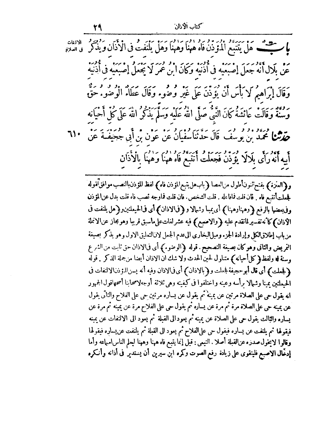 و (العنزة) بفتح النون أطول من العصا (باب هل يتبع المؤذن فاه) لفظ المؤذن بالنصب موافق أقوله فجعلت أتتبع فاه. فإن قلت فما فاعله، قلت الشخص، فإن قلت فما وجه نصب فاه قلت بدل عن المؤذن وفي بعضها بالرفع (وههنا وههنا) أي يميناً وشمالاً و (في الأذان) أي في الجيعلتين و (هل يلتفت في الأذان) كأنه تفسير لما تقدم عليه (والإصبع) فيه عشر لغات على ما سبق قريباً وهو مجاز عن الأنملة من باب إطلاق الكل وإرادة الجزء وميل البخاري إلى عدم الجعل لأن التعليق الأول وهو يذكر بصيغة التمريض والثاني وهو كان بصيغة التصحيح، قوله (الوضوء) أي في الأذان حق ثابت من الشرع وسنة له ولفظ (كل أحيائه) متناول لحين الحدث ولا شك أن الأذان أيضاً من جملة الذكر، قوله (فجعلت) أي قال أبو حنيفة فجعلت و (بالأذان) أي في الأذان وفيه أن يسن المؤذن الالتفات في الحيعلتين يميناً وشمالاً برأسه وعينه واختلفوا في كيفيته وهي ثلاثة أوجه لأصحابنا اسمها قول الجمهور أنه يقول حي على الصلاة مرتين عن يمينه ثم يقول عن يساره مرتين حي على الفلاح والثاني يقول عن يمينه حي على الصلاة مرة ثم مرة عن يساره ثم يقول حي على الفلاح مرة عن يمينه ثم مرة عن يساره والثالث يقول حي على الصلاة عن يمينه ثم يعود إلى القبلة ثم يعود إلى الالتفات عن يمينه فيقولها ثم يلتفت عن يساره فيقول حي على الفلاح ثم يعود إلى القبلة ثم يلتفت عن يساره فيقولها وقالوا لا يخول صدره عن القبلة أصلاً، التيمي: قيل إنما يتبع فاه ههنا وههنا ليعلم الناس أسماعه وأما إدخال الإصبع فليتقوى على زيادة رفع الصوت وكره ابن سيرين أن يستدير في أذانه وأنكره