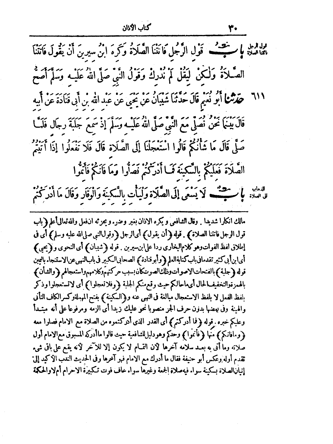 مالك إنكاراً شديداً، وقال الشافعي ويكره الأذان بغير وضوء ويجزئه أن فعل والله تعالى أعلم (باب قول الرجل فاتتنا الصلاة)، قوله (أن يقول) أي الرجل (وقول النبي صلّى الله عليه وسلّم) أي في إطلاق لفظ الفوات وهو كلام البخاري رداً على ابن سيرين، قوله (شيبان) أي النحوي و (يحيى) أي ابن أبي كثير تقدماً في باب كتابة العلم (وأبو قتادة) الصحابي الكبير في باب النهي عن الاستنجاء باليمين قوله (جلية) بالفتحات الأصوات وذلك الصوت كان بسبب حركتهم وكلامهم واستعجالهم (والشأن) بالهمزة والتخفيف الحال أي ما حالكم حيث وقع منكم الجلبة (وفلا تعجلوا) أي لا تستعجلوا وذكر بلفظ الفعل لا بلفظ الاستعجال مبالغة في النهي عنه و (السكينة) بفتح المهملة وكسر الكاف التأني والهينة وفي بعضها بدون حرف الجز منصوباً نحو عليك زيداً أي ألزمه ومرفوعاً على انه مبتدأ وعليكم خبره. قوله (فما أدركتم) أي القدر الذي أدركتموه من الصلاة مع الإمام فصلوا معه (وما فاتكم) منها (فأتموا) وحدكم وهو دليل للشافعية حيث قالوا ما أدركه المسبوق مع الإمام أول صلاته وما أتى به بعد سلامه آخرها لأن التمام لا يكون إلا للآخر لأنه يقع على باقي شيء تقدم أوله، وعكس أبو حنيفة فقال ما أدرك مع الإمام فهو آخرها وفي الحديث الندب الأكيد إلى إتيان الصلاة بسكينة سواء فيه صلاة الجمعة وغيرها سواء خاف فوت تكبيرة الإحرام أم لا والحكمة