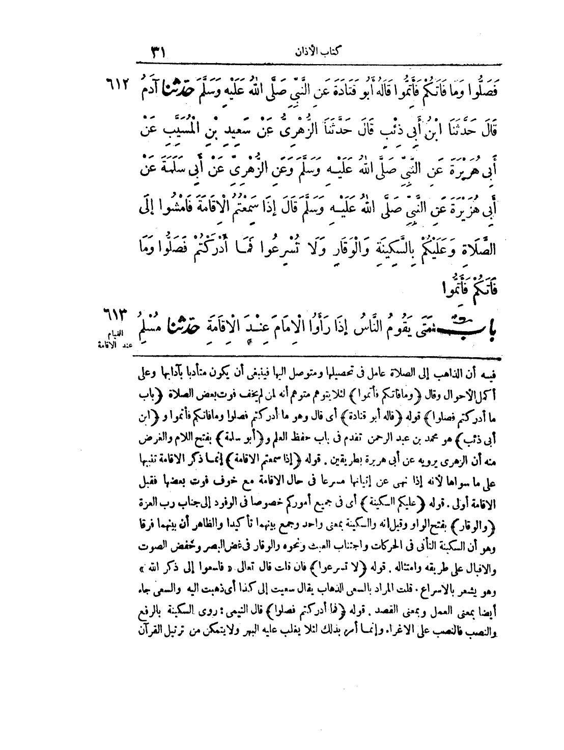 فيه أن الذاهب إلى الصلاة عامل في تحصيلها ومتوصل إليها فينبغي أن يكون متأدباً بآدابها وعلى أكمل الأحوال وقال (وما فاتكم فأتموا) لئلا يتوهم متوهم أنه لمن لم يخفف فوت بعض الصلاة (باب ما أدرتكم فصارا) قوله (قاله أبو قتادة) أي قال وهو ما أدركتم فصلوا وما فاتكم فأتموا و (ابن أبي ذئب) هو محمد بن عبد الرحمن تقدم في باب حفظ العلم و (أبو سلمة) بفتح اللام والغرض منه أن الزهري يرويه عن أبي هريرة بطريقين. قوله (إذا سمعتم الإقامة) إنما ذكر الإقامة تنبيهاً على ما سواها لأنه إذا نهى عن إتيانها مسرعاً في حال الإقامة مع خوف فوت بعضها فقبل الإقامة أولى. قوله (عليكم السكينة) أي في جميع أموركم خصوصاً في الوفود إلى جناب رب العزة (والوقار) بفتح الواو وقيل أنه والسكينة بمعنى واحد وجمع بينهما تأكيداً والظاهر أن بينهما فرقاً وهو أن السكينة التأني في الحركات واجتناب العبث ونحوه والوقار في غض البصر وخفض الصوت والإقبال على طريقه وامتثاله، قوله (لا تسرعوا) فإن قلت قال تعالى (فاسعوا إلى ذكر الله) وهو يشعر بالإسراع، قلت المراد بالسعي الذهاب يقال سعيت إلى كذا أي ذهبت إليه والسعي جاء أيضاً بمعنى العمل وبمعنى القصد، قوله (فما أدركتم فصلوا) قال التيمي: روى السكينة بالرفع والنصب فالنصب على الإغراء وإنما أمر بذلك لئلا يغلب عليه البهر ولا يتمكن من ترتيل القرآن