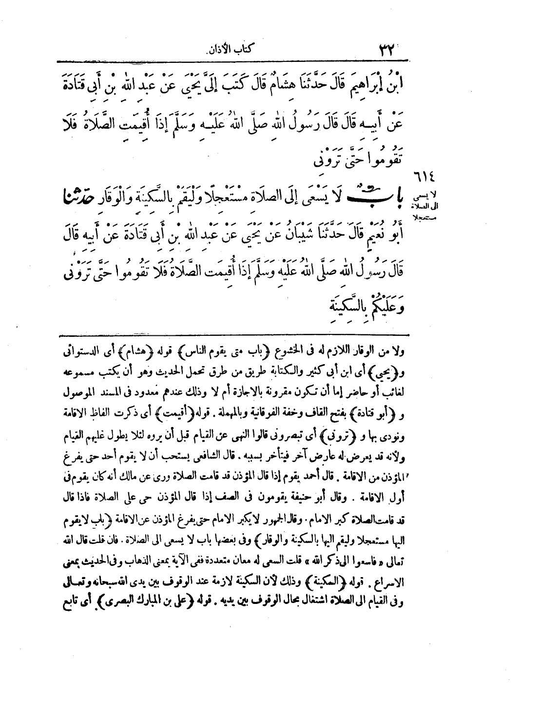 614 - حَدَّثنا أَبُو نُعَيْمٍ، قَالَ: حَدَّثنا شَيْبَانُ، عَنْ يَحْيَى، عَنْ عَبْدِ اللهِ بْنِ أَبِي قَتَادَةَ، عَنْ أَبِيهِ، قَالَ: قَالَ رَسُولُ اللهِ صَلى الله عَلَيهِ وسَلمَ: إِذَا أُقِيمَتِ الصَّلاَةُ، فَلاَ تَقُومُوا حَتَّى تَرَوْنِي، وَعَلَيْكُمْ بِالسَّكِينَةِ