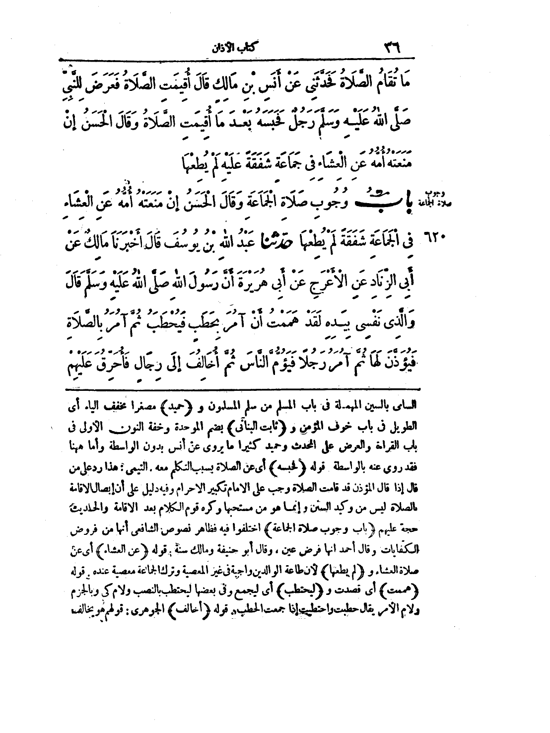 السامي بالسين المهملة في باب المسلم من سلم المسلمون و (حميد) مصغراً مخفف الياء أي الطويل في باب خوف المؤمن و (ثابت البناني) بضم الموحدة وخفة النون الأولى في باب القراءة والعرض على المحدث وحميد كثيراً ما يروي عن أنس بدون الواسطة وأما ههنا فقد روى عنه بالواسطة، قوله (فحبسه) أي عن الصلاة بسبب التكلم معه، التيمي، هذا رد على من قال إذا قال المؤذن قد قامت الصلاة وجب على الإمام تكبير الإحرام وفيه دليل على أن إيصال الإقامة بالصلاة ليس من وكيد السنن وإنما هو من مستحبها وكره قوم الكلام بعد الإقامة والحديث حجة عليهم (باب وجوب صلاة الجماعة) اختلفوا فيه فظاهر نصوص الشافعي أنها من فروض الكفايات وقال أحمد أنها فرض عين، وقال أبو حنيفة ومالك سنة، قوله (عن العشاء) أي عن صلاة العشاء و (لم يطعها) لأن طاعة الوالدين واجبة في غير المعصية وترك الجماعة معصية عنده، قوله (هممت) أي قصدت و (ليحتطب) أي ليجمع وفي بعضها ليحتطب بالنصب ولام كي وبالجزم ولام الأمر يقال حطبت واحتطبت إذا جمعت الحطب، وقوله (أخالف) الجوهري: قولهم هو يخالف