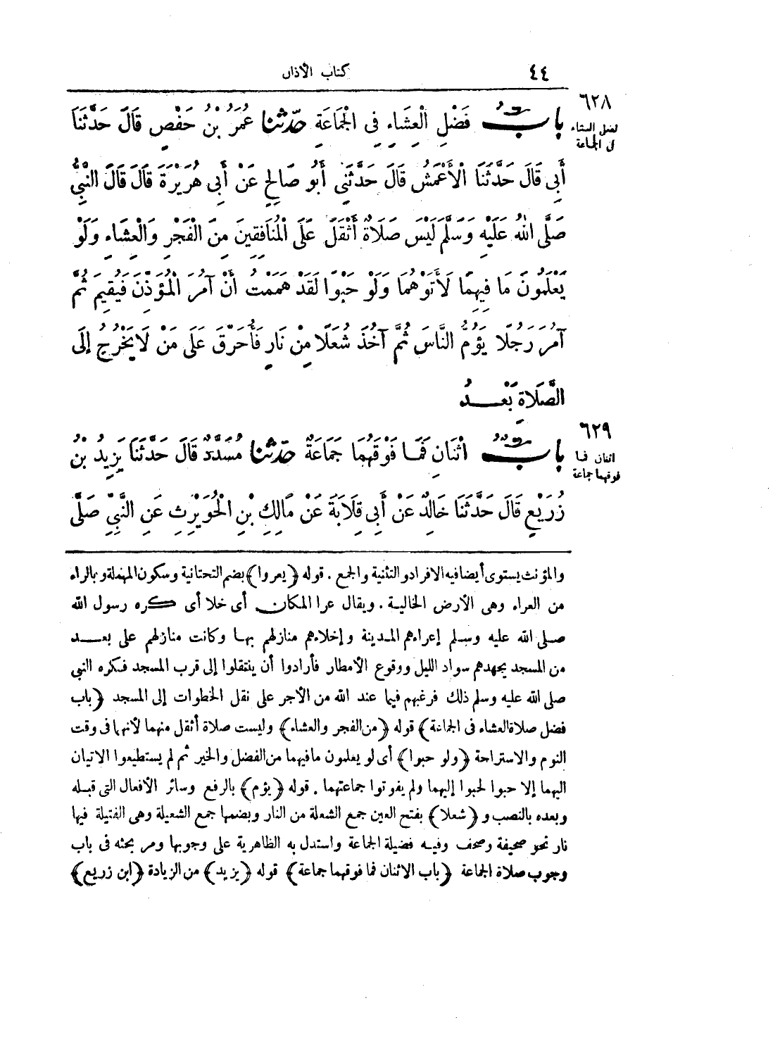 والمؤنث يستوي أيضاً فيه الإفراد والتثنية والجمع. قوله (يعروا) بضم التحتانية وسكون المهملة وبالراء من العراء وهي الأرض الخالية. ويقال عرا المكان أي خلا أي كره رسول الله صلّى الله عليه وسلّم إعراءهم المدينة وإخلاءهم منازلهم بها وكانت منازلهم على بُعد من المسجد يجهدهم سواد الليل ووقوع الأمطار فأرادوا أن ينتقلوا إلى قرب المسجد فكره النبي صلّى الله عليه وسلّم ذلك فرغبهم فيما عند الله من الأجر على نقل الخطوات إلى المسجد (باب فضل صلاة العشاء في الجماعة) قوله (من الفجر والعشاء) وليست صلاة أثقل منهما لأنهما في وقت النوم والاستراحة (ولو حبوا) أي لو يعلمون ما فيها من الفضل والخير ثم لم يستطيعوا الإتيان إليهما إلا حبواً لحبوا إليهما ولم يفوتوا جماعتهما. قوله (يؤم) بالرفع وسائر الأفعال التي قبله وبعده بالنصب و (شعلا) بفتح العين جمع الشعلة من النار وبضمها جمع الشعيلة وهي الفتيلة فيها نار نحو صحيفة وصحف وفيه فضيلة الجماعة واستدل به الظاهرية على وجوبها ومر بحثه في باب وجوب صلاة الجماعة (باب الاثنان فما فوقهما جماعة) قوله (يزيد) من الزيادة (ابن زريع)