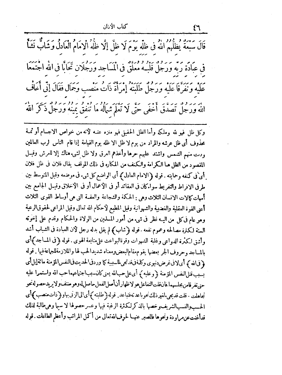 وكل ظل فهو لله وملكه وأما الظل الحقيقي فهو منزه عنه لأنه من خواص الأجسام أو ثمة محذوف أي ظل عرشه والمراد من لا ظل إلا ظله يوم القيامة إذا قام الناس لرب العالمين ودنت منهم الشمس واشتد عليهم حرها وأخذهم العرق ولا ظل لشئ هناك إلا للعرش وقيل المقصود من الظل هنا الكرامة والكنف من المكاره في ذلك الموقف يقال فلان في ظل فلان أي في كنفه وحمايته. قوله (الإمام العادل) أي الواضع كل شئ في موضعه وقيل المتوسط بين طرفي الإفراط والتفريط سواء كان في العقائد أو في الأعمال أو في الأخلاق وقيل الجامع بين أمهات كمالات الإنسان الثلاث وهي: الحكمة والشجاعة والعفة التي هي أوساط القوى الثلاث أعني القوة العقلية والغضبية والشهوانية وقيل المطيع لأحكام الله تعالى وقيل المراعي لحقوق الرعية وهو عام في كل من إليه نظر في شئ من أمور المسلمين من الولاة والحكام وقدم على إخوته الستة لكثرة مصالحه وعموم نفعه. قوله (شاب) لم يقل بدله رجل لأن العبادة في الشباب أشد وأشق لكثرة الدواعي وغلبة الشهوات وقوة البواعث على متابعة الهوى. قوله (في المساجد) أي بالمساجد وحروف الجر بعضها يقوم مقام البعض ومعناه شديد الحب لها والملازمة للجماعة فيها. قوله (في الله) أي لا في غرض دنيوي وكلمة قد تجئ للسببية كما ورد في الحديث في النفس المؤمنة مائة إبل أي بسبب قتل النفس المؤمنة (وعليه) أي على حب الله يعني كان سبب اجتماعهما حب الله واستمرا عليه حتى تفرقا من مجلسهما فإن قلت التفاعل هو لإظهار أن أصل الفعل حاصل له وهو صنف ولا يريد حصوله نحو تجاهلت. قلت قد يجئ لغير ذلك نحو باعدته فتباعد. قوله (طلبته) أي إلى الزنى بها و (ذات منصب) أي الحسب والنسب الشريف وخصها بالذكر لكثرة الرغبة فيها وعسر حصولها لا سيما وهي طالبة لذلك قد أغنت عن مراودة ونحوها فالصبر عنها لخوف الله تعالى من أكمل المراتب وأعظم الطاعات. قوله