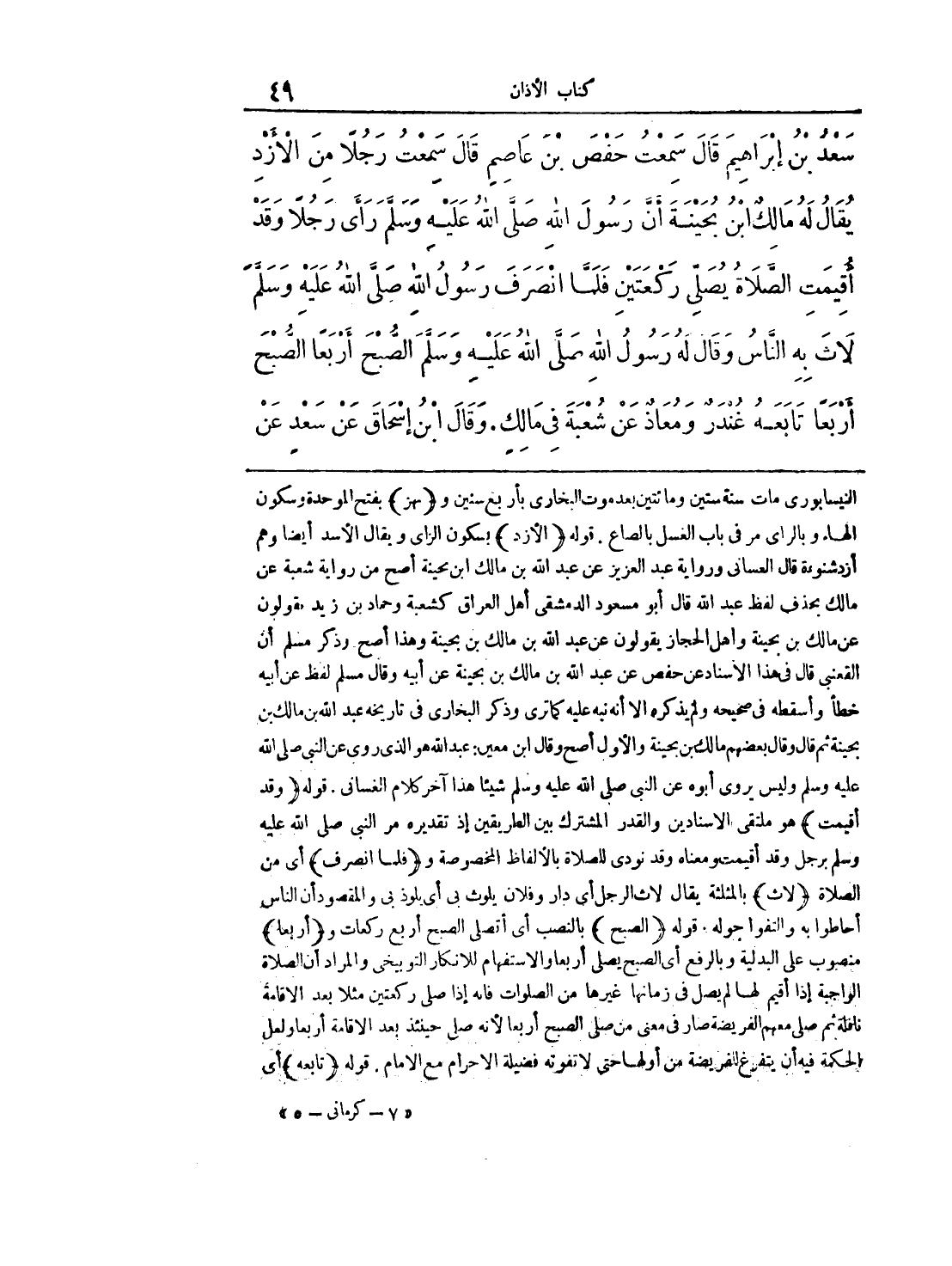 سَعْدُ بْنُ إِبْرَاهِيمَ، قَالَ: سَمِعْتُ حَفْصَ بْنَ عَاصِمٍ، قَالَ: سَمِعْتُ رَجُلاً مِنَ الأَزْدِ يُقَالُ لَهُ: مَالِكٌ ابْنُ بُحَيْنَةَ؛ أَنَّ رَسُولَ اللهِ صَلى الله عَلَيهِ وسَلمَ رَأَى رَجُلاً وَقَدْ أُقِيمَتِ الصَّلاَةُ يُصَلِّي رَكْعَتَيْنِ، فَلَمَّا انْصَرَفَ رَسُولُ اللهِ صَلى الله عَلَيهِ وسَلمَ لاَثَ بِهِ النَّاسُ، وَقَالَ لَهُ رَسُولُ اللهِ صَلى الله عَلَيهِ وسَلمَ: آلصُّبْحَ أَرْبَعًا، آلصُّبْحَ أَرْبَعًا. تَابَعَهُ غُنْدَرٌ، وَمُعَاذٌ، عَنْ شُعْبَةَ، عَنْ مَالِكٍ. وَقَالَ ابْنُ إِسْحَاقَ: عَنْ سَعْدٍ، عَنْ