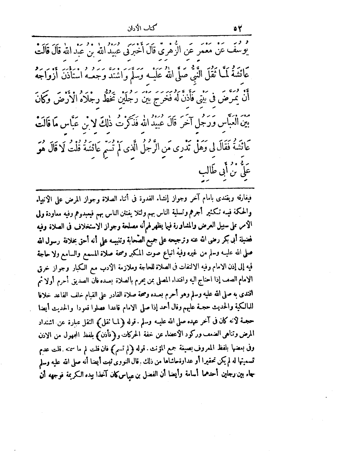 يُوسُفَ، عَنْ مَعْمَرٍ، عَنِ الزُّهْرِيِّ، قَالَ: أَخْبَرَنِي عُبَيْدُ اللهِ بْنُ عَبْدِ اللهِ، قَالَ: قَالَتْ عَائِشَةُ: لَمَّا ثَقُلَ النَّبِيُّ صَلى الله عَلَيهِ وسَلمَ، وَاشْتَدَّ وَجَعُهُ، اسْتَاذَنَ أَزْوَاجَهُ أَنْ يُمَرَّضَ فِي بَيْتِي، فَأَذِنَّ لَهُ، فَخَرَجَ بَيْنَ رَجُلَيْنِ تَخُطُّ رِجْلاَهُ الأَرْضَ، وَكَانَ بَيْنَ العَبَّاسِ وَرَجُلٍ آخَرَ، قَالَ عُبَيْدُ اللهِ: فَذَكَرْتُ ذَلِكَ لاِبْنِ عَبَّاسٍ مَا قَالَتْ عَائِشَةُ، فَقَالَ لِي: وَهَلْ تَدْرِي مَنِ الرَّجُلُ الَّذِي لَمْ تُسَمِّ عَائِشَةُ؟ قُلْتُ: لاَ، قَالَ: هُوَ عَلِيُّ بْنُ أَبِي طَالِبٍ