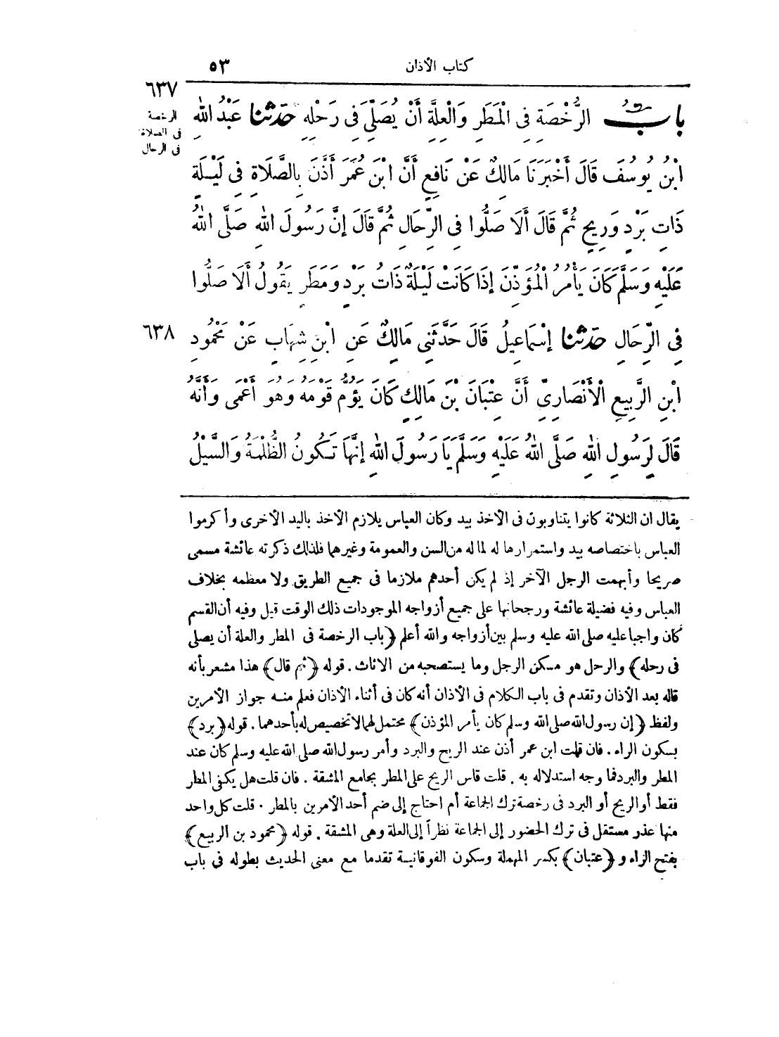 637 - حَدَّثنا عَبْدُ اللهِ بْنُ يُوسُفَ، قَالَ: أَخبَرَنا مَالِكٌ، عَنْ نَافِعٍ، أَنَّ ابْنَ عُمَرَ أَذَّنَ بِالصَّلاَةِ فِي لَيْلَةٍ ذَاتِ بَرْدٍ وَرِيحٍ، ثُمَّ قَالَ: أَلاَ صَلُّوا فِي الرِّحَالِ، ثُمَّ قَالَ: إِنَّ رَسُولَ اللهِ صَلى الله عَلَيهِ وسَلمَ كَانَ يَامُرُ المُؤَذِّنَ إِذَا كَانَتْ لَيْلَةٌ ذَاتُ بَرْدٍ وَمَطَرٍ، يَقُولُ: أَلاَ صَلُّوا فِي الرِّحَالِ.