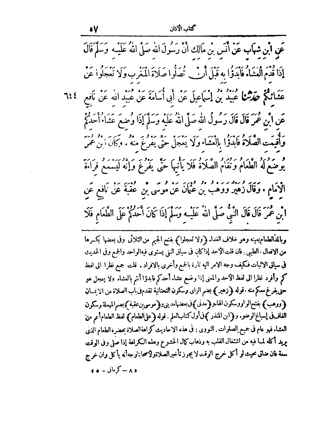 وبالمد الطعام بعينه وهو خلاف الغداء (ولاتعجلوا) بفتح الجيم من الثلاثي وفي بعضها بكسرها من الافعال. الطيبي: فإن قلت الاحد إذا كان في سياق النفي يستوي فيع الواحد والجمع وفي الحديث في سياق الاثبات فكيف وجه الامر إليه تارة بالجمع واخرى بالافراد. قلت جمع نظرا إلى اللفظ كم وافرد نظرا إلى لفظ الاجد والمعنى إذا وضع عشاء أحدكم فابدؤا انتم بالعشاء ولا يعجل هو حتى يفرغ معكم منه. قوله (زهير) بصم الزاى وسكون التحتانية تقدم في باب الصلاة من الإيمان (ووهب) بفتح الواو وسكون الهاء و (مدنى) في بعضها يا مدينى و (موسى بن عقبة) بصم لمهملة وسكون القاف في إسباغ الوضوء و (ابن المنذر) في أول كتاب العلم. قوله (على الطعام) لفظ الطعام أعم من العشاء فهو عام في جميع الصلوات. النووي: في هذه الاحاديث كراهة الصلاة بحضرة الطعام الذي يريد أكلهلما فيه من اشتغال القلب به وذهاب كمال الخشوع وهذه الكراهة إذا صلى وفي الوقت سعة فإن ضاق بحيث لو اكل خرج الوقت لا يجوز تأخير الصلاة ولاصحابنا وجه انه يأكل وإن خرج