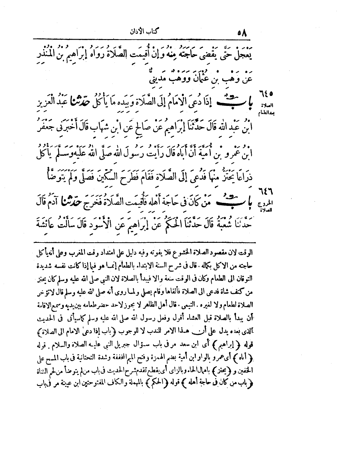 الوقت لأن مقصود الصلاة الخضوع فلا يفوته وفيه دليل على إمتداد وقت المغرب وعلى أنه يأكل حاجته من الاكل بكماله. قال في شرح السنة الابتداء بالطعام إنما هو فيما إذا كانت نفسه شديدة التوقان إلى الطعام وكان في الوقت سعة والا فيبدأ بالصلاة لأن النبي صلى الله عليه وسلم كان يحتز من كنف شاة فدعى الى الصلاة فألقاها وقام يصلى ولما روى أنه صلى الله عليه وسلم قال لاتؤخر الصلاة لطعام ولا لغيره. التيمى. قال أهل الظاهر لا يجوز لأحد حضر طعامه بين يديه وسمع الاقامة أن يبدأ بالصلاة قبل العشاء أقول وفعل رسول الله صلى الله عليه وسلم كما سيأتي في الحديث الذي بعده يدل على أن هذا الامر للندب لا للوجوب (باب إذا دعى الامام إلى الصلاة) قوله (ابراهيم) أي ابن سعد مر في باب سؤال جبريل النبي عليه الصلاة والسلام. قوله (اباه) أي عمرو بالواو ابن امية بضم الهمزة وفتح الميم المخففة وشدة تحتانية في باب المسح على الخفيين و (ويحز) بإهمال الحاء وبالزاي أي يقطع تقدم شرح الحديث في باب من لم يتوضأ من لحم الشاة (باب من كان في حاجة أهله) قوله (الحكم) بالمهملة والكاف المفتوحتين ابن عتيبة مر في باب