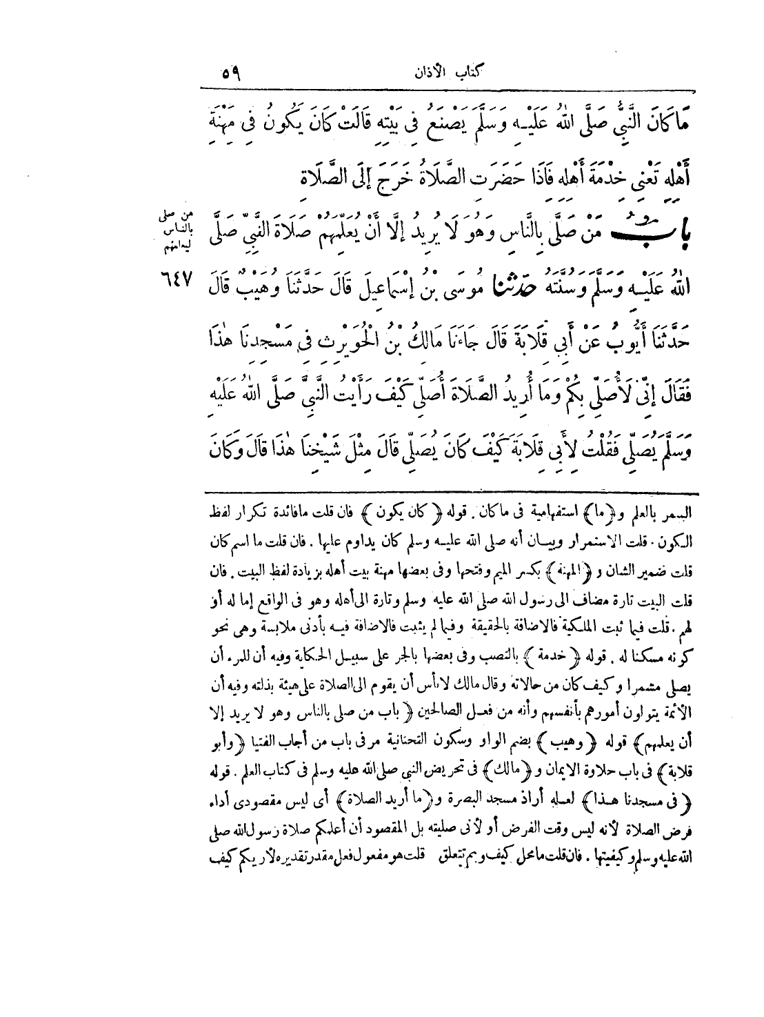 السمر بالعلم و (ما) استفهامية في ما كان. قوله (كان يكون) فإن قل ما فائدة تكرار لفظ الكون. قلت الاستمرار وبيان أنه صلى الله عليه وسلم كان يداوم عليها. فان قلت ما اسم كان قلت ضمير الشان و (المهنة) بكسر الميم وفتحها وفي بعضها مهنة بيت اهله بزيادة لفظ البيت. فان قلت البيت تارة مضاف إلى رسول الله صلى الله عليه وسلم وتارة إلى اهله وهو في الواقع اما له او لهم، قلتفيما ثبت الملكية فالاضافة بالحقيقة وفيما لم يثبت فالاضافة فيه بالادنى ملابسة وهي نحو كونه مسكنا له، قوله (خدمة) بالنصب وفي بعضها بالجر على سبيل الحكاية وفيه ان المرء ان يصلى متسمرا وكيف كان من حالاته وقال مالك لا بأس أن يقوم إلى الصلاة على هيئة بذلته وفيه ان الائمة يتولون أمورهم بأنفسهم وانه من فعل الصالحين (باب من صلى بالناس وهو لا يريد الا ان يعلمهم à قوله (وهيب) بضم الواو وسكون التحتانية مر في باب من أجاب الفتيا (وابو قلابة) في باب حلاوة الايمان و (مالك) في تحريض النبي صلى الله عليه وسلم في كتاب العلم. قوله (في مسجدنا هذا) لعله اراد مسجد البصرة و (ماأريد الصلاة) اي ليس مقصودي اداء فرض الصلاة لأنه ليس وقت الفرض او لأني صلته بل المقصود ان أعلمكم صلاة رسول الله صلى الله عليه وسلم وكيفيتها. فإن قلت ما محل كيف وبم تتعلق قلت هو مفعول فعل مقدر تقديره لأريكم كيف
