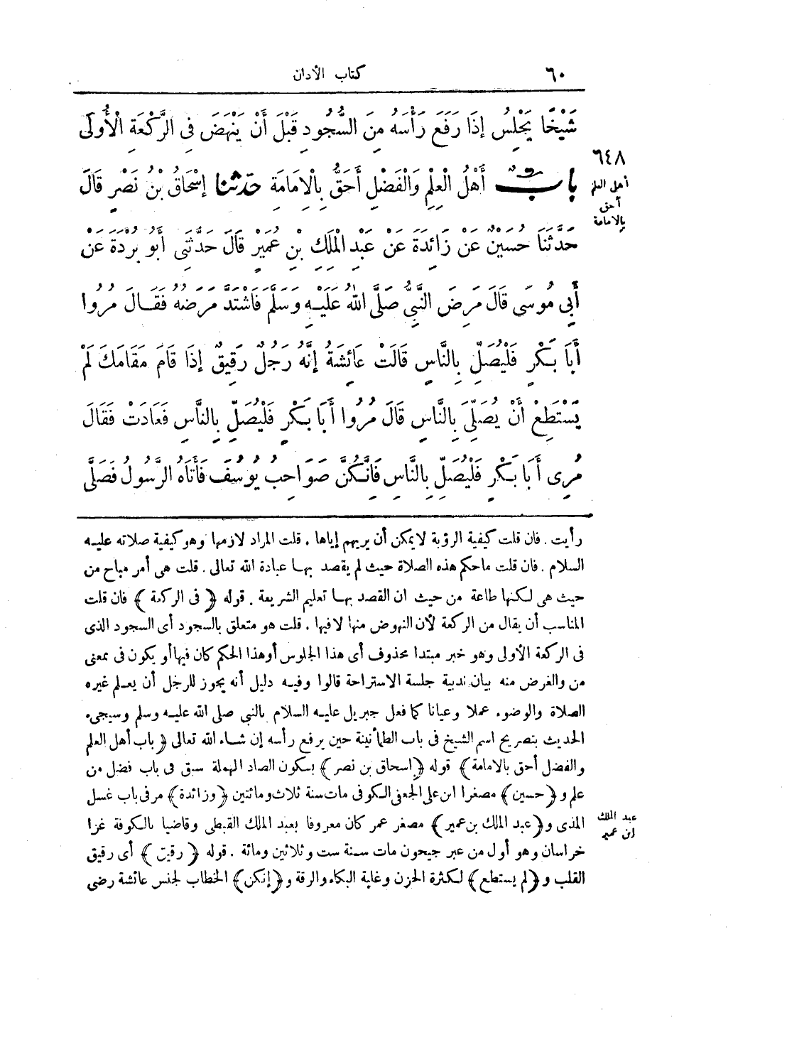 رأيت. فإن قلت كيفية الرؤية لا يمكن أن يريهم إياها. قلت المراد لازمها وهو كيفية صلاته عليه السلام. فإن قلت ماحكم هذه الصلاة حيث لم يقصد بها عبادة الله تعالى. قلت هي أمر مباح من حيث هي لكنها طاعة من حيث القصد بها تعليم الشريعة. قوله (في الركوع) فإن قلت المناسب أن يقال من الركعة لأن النهوض منها لا فيها. قلت هو متعلق بالسجود أي السجود الذي في الركعة الاولى وهو خبر مبتدأ محذوف أي هذا الجلوس أو هذا الحكم كان فيها أو يكون في معنى من والغرض منه بيان ندية جلسة الاستراحة قالوا وفيه دليل أنه يجوز للرجل أن يعلم غيره الصلاة والوضوء عملا وعيانا كما فعل جبريل عليه السلام بالنبي صلى الله عليه وسلم وسيجيئ الحديث بتصريح اسم الشيخ في باب الطمأنينة حين يرفع رأسه إن شاء الله تعالى (باب أهل العلم والفضل أحق بالامامة) قوله (اسحاق بن نصر) بسكون الصاد المهملة سبق في باب فضل من علم و (حسين) مصفرا ابن على الجعفي الكوفي مات سنة ثلاث ومائتين (وزائدة) مر في باب غسل المذي و (عبد المالك بن عمير) مصغر عمر كان معروفا بعبد الملك القبطي وقاضيا بالكوفة غزا خراسان وهو أول من عبر جيحون مات سنة ست وثلاثين ومائة. قوله (رقين) أي رقيق القلب و (لم يستطع) لكثرة الحزن وغلبة البكاء والرقة و (أنكن) الخطاب لجنس عائشة رضي