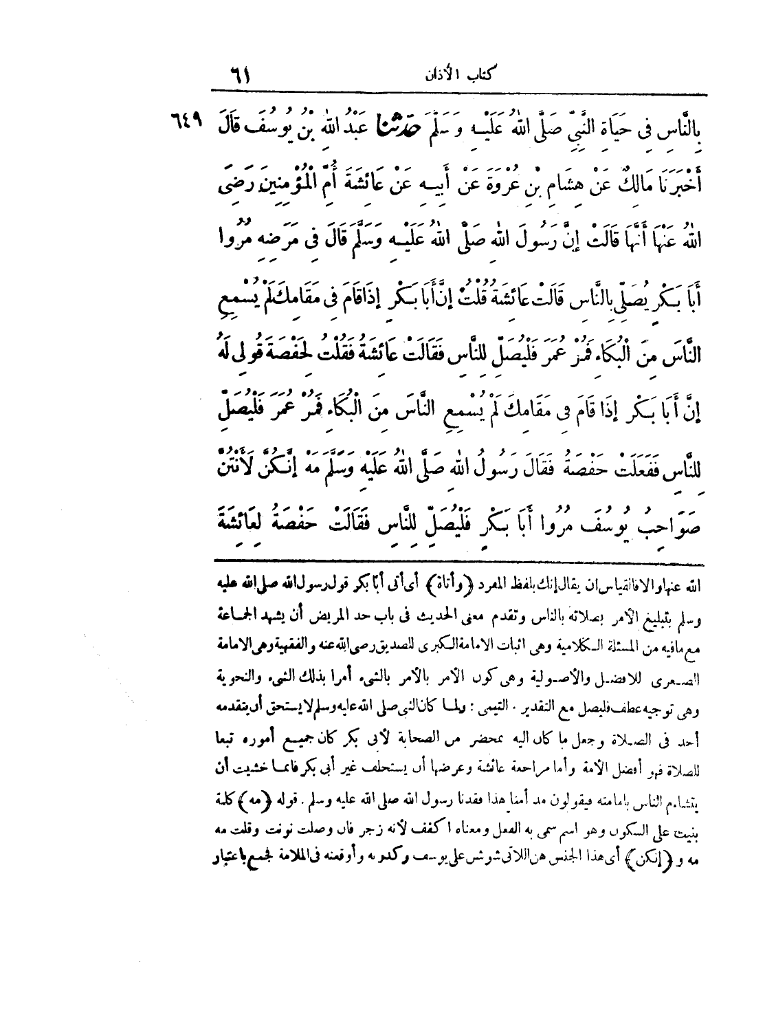 649 - حَدَّثنا عَبْدُ اللهِ بْنُ يُوسُفَ، قَالَ: أَخبَرَنا مَالِكٌ، عَنْ هِشَامِ بْنِ عُرْوَةَ، عَنْ أَبِيهِ، عَنْ عَائِشَةَ أُمِّ المُؤْمِنِينَ، رَضِيَ اللهُ عَنْهَا، أَنَّهَا قَالَتْ: إِنَّ رَسُولَ اللهِ صَلى الله عَلَيهِ وسَلمَ قَالَ فِي مَرَضِهِ: مُرُوا أَبَا بَكْرٍ يُصَلِّي بِالنَّاسِ، قَالَتْ عَائِشَةُ: قُلْتُ: إِنَّ أَبَا بَكْرٍ إِذَا قَامَ فِي مَقَامِكَ لَمْ يُسْمِعِ النَّاسَ مِنَ البُكَاءِ، فَمُرْ عُمَرَ فَلْيُصَلِّ لِلنَّاسِ، فَقَالَتْ عَائِشَةُ: فَقُلْتُ لِحَفْصَةَ: قُولِي لَهُ: إِنَّ أَبَا بَكْرٍ إِذَا قَامَ فِي مَقَامِكَ لَمْ يُسْمِعِ النَّاسَ مِنَ البُكَاءِ، فَمُرْ عُمَرَ فَلْيُصَلِّ لِلنَّاسِ، فَفَعَلَتْ حَفْصَةُ، فَقَالَ رَسُولُ اللهِ صَلى الله عَلَيهِ وسَلمَ: مَهْ، إِنَّكُنَّ لأَنْتُنَّ صَوَاحِبُ يُوسُفَ، مُرُوا أَبَا بَكْرٍ فَلْيُصَلِّ لِلنَّاسِ، فَقَالَتْ حَفْصَةُ لِعَائِشَةَ