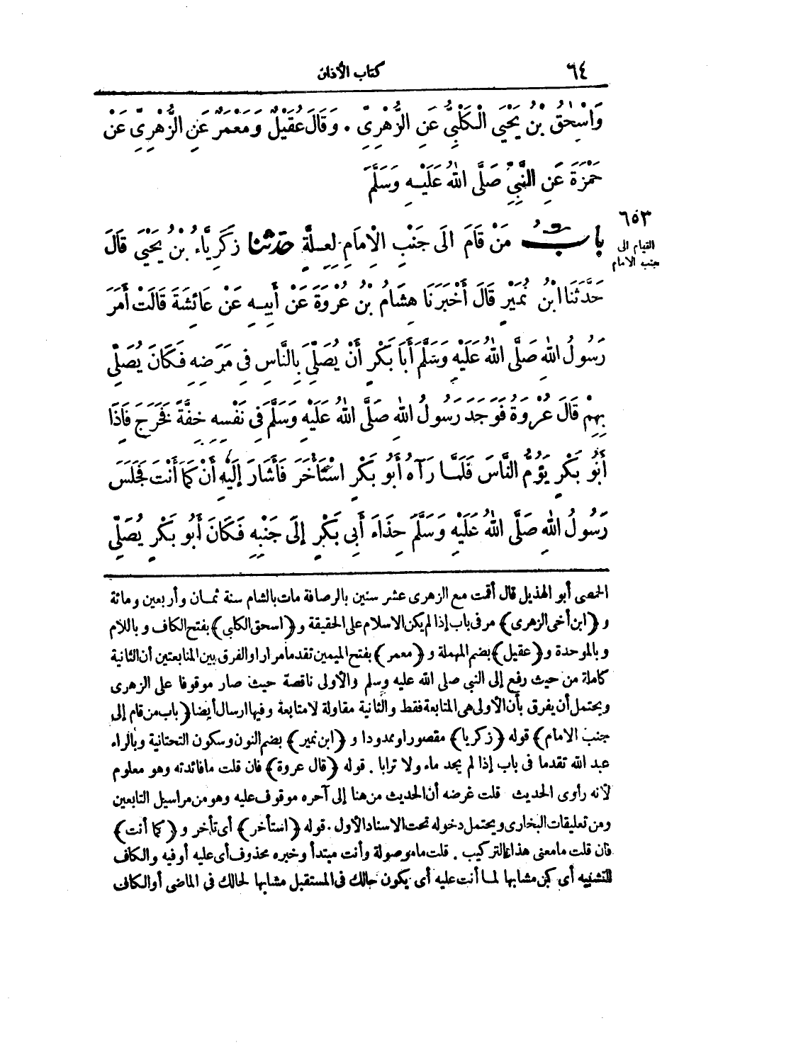 653 - حَدَّثنا زَكَرِيَّا بْنُ يَحْيَى، قَالَ: حَدَّثنا ابْنُ نُمَيْرٍ، قَالَ: أَخبَرَنا هِشَامُ بْنُ عُرْوَةَ، عَنْ أَبِيهِ، عَنْ عَائِشَةَ، قَالَتْ: أَمَرَ رَسُولُ اللهِ صَلى الله عَلَيهِ وسَلمَ أَبَا بَكْرٍ أَنْ يُصَلِّيَ بِالنَّاسِ فِي مَرَضِهِ، فَكَانَ يُصَلِّي بِهِمْ، قَالَ عُرْوَةُ: فَوَجَدَ رَسُولُ اللهِ صَلى الله عَلَيهِ وسَلمَ فِي نَفْسِهِ خِفَّةً، فَخَرَجَ، فَإِذَا أَبُو بَكْرٍ يَؤُمُّ النَّاسَ، فَلَمَّا رَآهُ أَبُو بَكْرٍ، اسْتَاخَرَ، فَأَشَارَ إِلَيْهِ: أَنْ كَمَا أَنْتَ، فَجَلَسَ رَسُولُ اللهِ صَلى الله عَلَيهِ وسَلمَ حِذَاءَ أَبِي بَكْرٍ إِلَى جَنْبِهِ، فَكَانَ أَبُو بَكْرٍ يُصَلِّي