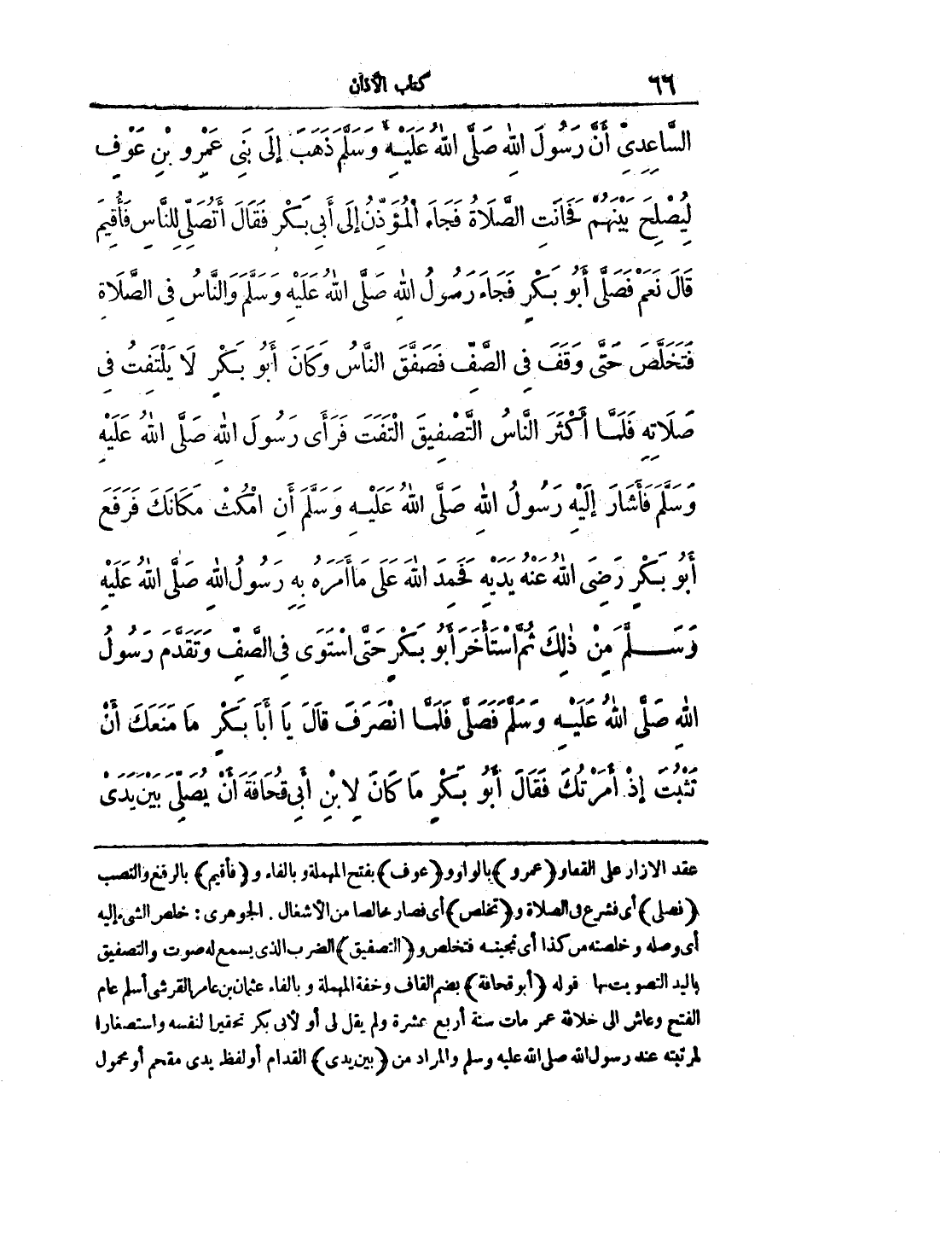 السَّاعِدِيِّ أَنَّ رَسُولَ اللهِ صلى الله عليه وسلم ذَهَبَ إِلَى بَنِي عَمْرِو بْنِ عَوْفٍ لِيُصْلِحَ بَيْنَهُمْ فَحَانَتِ الصَّلاَةُ فَجَاءَ الْمُؤَذِّنُ إِلَى أَبِي بَكْرٍ فَقَالَ أَتُصَلِّي لِلنَّاسِ فَأُقِيمَ قَالَ نَعَمْ فَصَلَّى أَبُو بَكْرٍ فَجَاءَ رَسُولُ اللهِ صلى الله عليه وسلم وَالنَّاسُ فِي الصَّلاَةِ فَتَخَلَّصَ حَتَّى وَقَفَ فِي الصَّفِّ فَصَفَّقَ النَّاسُ، وَكَانَ أَبُو بَكْرٍ لاَ يَلْتَفِتُ فِي صَلاَتِهِ - فَلَمَّا أَكْثَرَ النَّاسُ التَّصْفِيقَ الْتَفَتَ فَرَأَى رَسُولَ اللهِ صلى الله عليه وسلم فَأَشَارَ إِلَيْهِ رَسُولُ اللهِ صلى الله عليه وسلم أَنِ امْكُثْ مَكَانَكَ فَرَفَعَ أَبُو بَكْرٍ، رَضِيَ اللَّهُ عَنْهُ، يَدَيْهِ فَحَمِدَ اللَّهَ عَلَى مَا أَمَرَهُ بِهِ رَسُولُ اللهِ صلى الله عليه وسلم مِنْ ذَلِكَ ثُمَّ اسْتَاخَرَ أَبُو بَكْرٍ حَتَّى اسْتَوَى فِي الصَّفِّ وَتَقَدَّمَ رَسُولُ اللهِ صلى الله عليه وسلم فَصَلَّى فَلَمَّا انْصَرَفَ قَالَ يَا أَبَا بَكْرٍ مَا مَنَعَكَ أَنْ تَثْبُتَ إِذْ أَمَرْتُكَ فَقَالَ أَبُو بَكْرٍ مَا كَانَ لاِبْنِ أَبِي قُحَافَةَ أَنْ يُصَلِّيَ بَيْنَ يَدَيْ