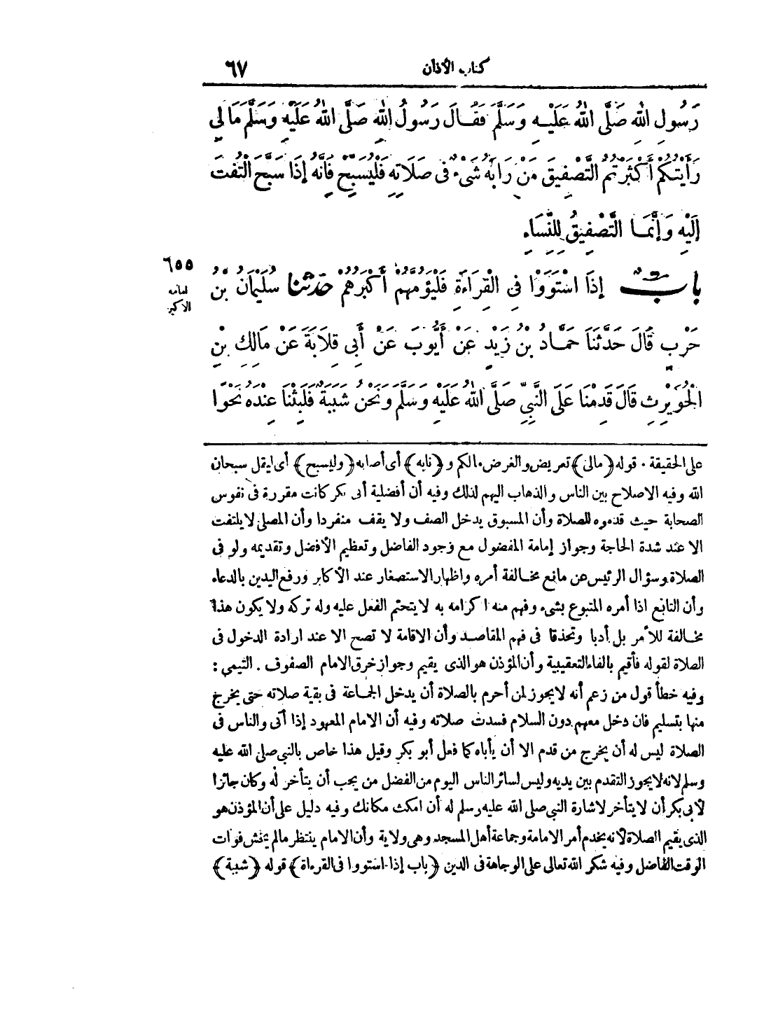 على الحقيقة. قوله (مالي) عريض والغرض. الكم (نابه) أي اصابه (وليسبح) اى لقل سبحان الله وفيه أصلاح بين الناس والذهاب اليهم لذلك وفيه ان فضيلة ابي بكر كانت مقررة في نفوس الصحابة حيث قدموه للصلاة وأن المسبوق يدخل الصف ولا يقف منفردا وأن المصلى لا يلتفت إلا عند شدة الحاجة وجواز إمامة المفضول مع وجود الفاضل وتعظيم الافضل وتقديمه ولو في الصلاة وسؤال الرئيس عن مانع مخالفة امره وإظهار الاستصغار عند الاكابر ورفع اليدين بالدعاء وأن النابع إذا أمره المتبوع بشيئ وفهم منه اكرامه به لا يتحتم الفعل عليه ولو تركه ولا يكون هذا مخالفة للأمر بل أدبا وتحذقا في فهم المقاصد وأن الاقامة لا تصح إلا عند ارادة الدخول في الصلاة لقوله فأقيم بإلغاء التعقيبية وان المؤذن هو الذي يقيم وجواز خرق الامام الصفوف. التيمي: وفيه خطأ قول من زعم أنه لا يجوز لمن أحرم بالصلاة أن يدخل الجماعة في يقية صلاته حى يخرج منها بالتسليم فإن دخل معهم دون السلام فسدت صلاته وفيه أن الامام المعهود إذا أتي والناس في الصلاة ليس له أن يخرج من قدم إلا أن أباه كما فعل أبو بكر وقيل هذا خاص بالنبي صلى الله عليه وسلم لأنه لا يجوز التقدم بين يديه وليس لسائر الناس اليوم من الفضل من يجب أن يتأخر له وكان جائزا لأبي بكر أن لا يتأخر لإشارة النبي صلى االله عليه وسلم له أن امكث مكانك وفيه دليل على أن المؤذن هو الذي يقيم الصلاة لأنه يخدم أمر الامامة وجماعة المسجد وهي ولاية وأن الامام ينتظر مالم يحض فوات الوقت الفاضل وفيه شكر الله تعالى على الوجاهة في الدين (باب إذا استتوا في القراءة) قوله (شيبة)