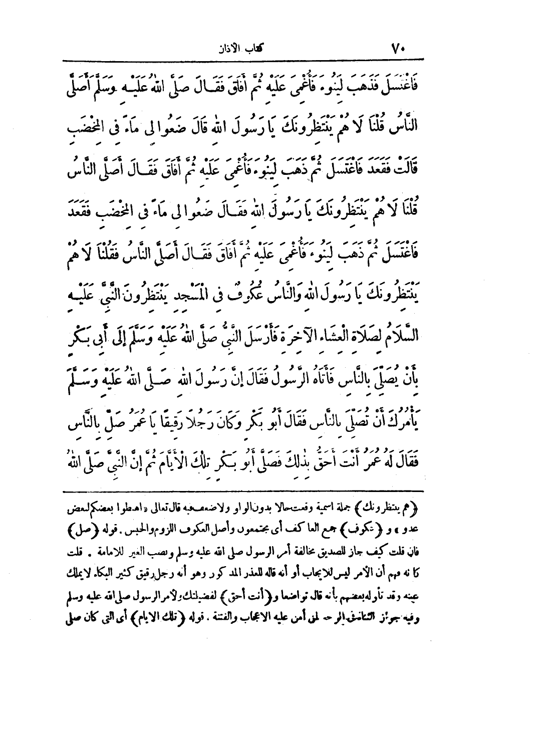 فَاغْتَسَلَ فَذَهَبَ لِيَنُوءَ فَأُغْمِيَ عَلَيْهِ ثُمَّ أَفَاقَ فَقَالَ صلى الله عليه وسلم أَصَلَّى النَّاسُ قُلْنَا لاَ هُمْ يَنْتَظِرُونَكَ يَا رَسُولَ اللهِ قَالَ ضَعُوا لِي مَاءً فِي الْمِخْضَبِ قَالَتْ فَقَعَدَ فَاغْتَسَلَ ثُمَّ ذَهَبَ لِيَنُوءَ فَأُغْمِيَ عَلَيْهِ ثُمَّ أَفَاقَ فَقَالَ أَصَلَّى النَّاسُ قُلْنَا لاَ هُمْ يَنْتَظِرُونَكَ يَا رَسُولَ اللهِ فَقَالَ ضَعُوا لِي مَاءً فِي الْمِخْضَبِ فَقَعَدَ فَاغْتَسَلَ ثمَّ ذَهَبَ لِيَنُوءَ فَأُغْمِيَ عَلَيْهِ ثُمَّ أَفَاقَ فَقَالَ أَصَلَّى النَّاسُ فَقُلْنَا لاَ هُمْ يَنْتَظِرُونَكَ يَا رَسُولَ اللهِ - وَالنَّاسُ عُكُوفٌ فِي الْمَسْجِدِ يَنْتَظِرُونَ النَّبِيَّ عَلَيْهِ السَّلاَمُ لِصَلاَةِ الْعِشَاءِ الآخِرَةِ - فَأَرْسَلَ النَّبِيُّ صلى الله عليه وسلم إِلَى أَبِي بَكْرٍ بِأَنْ يُصَلِّيَ بِالنَّاسِ فَأَتَاهُ الرَّسُولُ فَقَالَ إِنَّ رَسُولَ اللهِ صلى الله عليه وسلم يَامُرُكَ أَنْ تُصَلِّيَ بِالنَّاسِ فَقَالَ أَبُو بَكْرٍ، وَكَانَ رَجُلاً رَقِيقًا - يَا عُمَرُ صَلِّ بِالنَّاسِ فَقَالَ لَهُ عُمَرُ أَنْتَ أَحَقُّ بِذَلِكَ فَصَلَّى أَبُو بَكْرٍ تِلْكَ الأَيَّامَ ثُمَّ إِنَّ النَّبِيَّ صلى الله