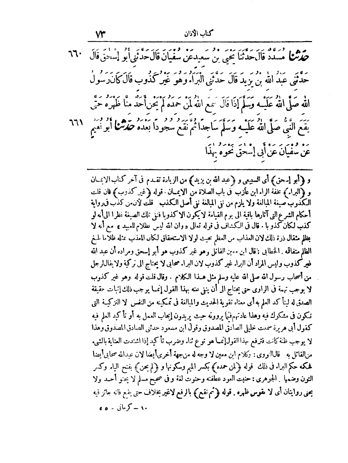 660 - حَدَّثَنَا مُسَدَّدٌ قَالَ: حَدَّثَنَا يَحْيَى بْنُ سَعِيدٍ، عَنْ سُفْيَانَ، قَالَ: حَدَّثَنِي أَبُو إِسْحَاقَ، قَالَ: حَدَّثَنِي عَبْدُ اللهِ بْنُ يَزِيدَ، قَالَ: حَدَّثَنِي الْبَرَاءُ، وَهْوَ غَيْرُ كَذُوبٍ، قَالَ: كَانَ رَسُولُ اللهِ صلى الله عليه وسلم إِذَا قَالَ سَمِعَ اللَّهُ لِمَنْ حَمِدَهُ لَمْ يَحْنِ أَحَدٌ مِنَّا ظَهْرَهُ حَتَّى يَقَعَ النَّبِيُّ صلى الله عليه وسلم سَاجِدًا ثُمَّ نَقَعُ سُجُودًا بَعْدَهُ.