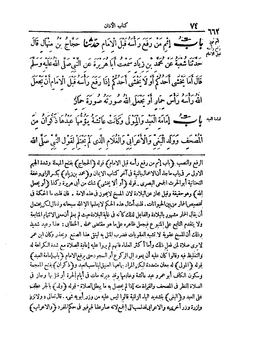 الرفع والنصب (باب إثم من رفع رأسه قبل الإمام) قوله (الحجاج) بفتح المهملة وشدة الجيم الأولى مر في باب ما جاء أن الأعمال بالنية في آخر كتاب الإيمان و (محمد بن زياد) بكسر الزاي وخفة التحتانية أبو الحرث الجمحي البصري قوله (أو ألا يخشى) شك من أبي هريرة وكذا (أو يجعل الله) وهو حقيقة وقبل مجاز عن البلادة لأن المسخ لا يجوز في هذه الأمة. فإن قلت ما الحكمة في تخصيص الحمار من بين الحيوانات. قلت أمثال هذه الحكم لا يعلمها إلا الله سبحانه وتعالى لكن يحتمل أن يقال الحمار مشهور بالبلادة والفاعل لذلك كأنه في غاية البلادة حيث لم يعلم أن معنى الائتمام المتابعة ولا يتقدم التابع على المتبوع فيجعل ظاهره على ما هو مقتضى عمله. الخطابي: هذا وعيد شديد وذلك أن المسخ عقوبة لا تشبه العقوبات فضرب المثل به ليتقي هذا الصنع ويحذر وكان ابن عمر لا يرى صلاة لمن فعل ذلك وأما أكثر العلماء فإنهم لم يروا عليه إعادة الصلاة مع شدة الكراهة له والتغليظ فيه وقالوا كان عليه أن يعود إلى الركوع أو السجود حتى يرفع الإمام (باب إمامة العبد) قوله (المولى) له معان متعددة لكن المراد بها ههنا العتيق ليناسب العبد و (ذكران) بفتح المعجمة وسكون الكاف أبو عمرو عبد عائشة وخادمها وقد دبرته مات في أيام الحرة أو قتل بها وجاز في الصلاة النظر في المصحف والقراءة منه إذا لم يحصل به ما يبطل الصلاة قوله (ولد) بالجر عطف على العبد و (البغي) بتشديد الياء الزانية قالوا ليس عليه من وزر أبويه شئ. قال تعالى: (ولا تزر وازرة وزر أخرى) والأعرابي قد نسب إلى الجمع لأنه صار علماً لهم فهو في حكم المفرد (والإعراب)
