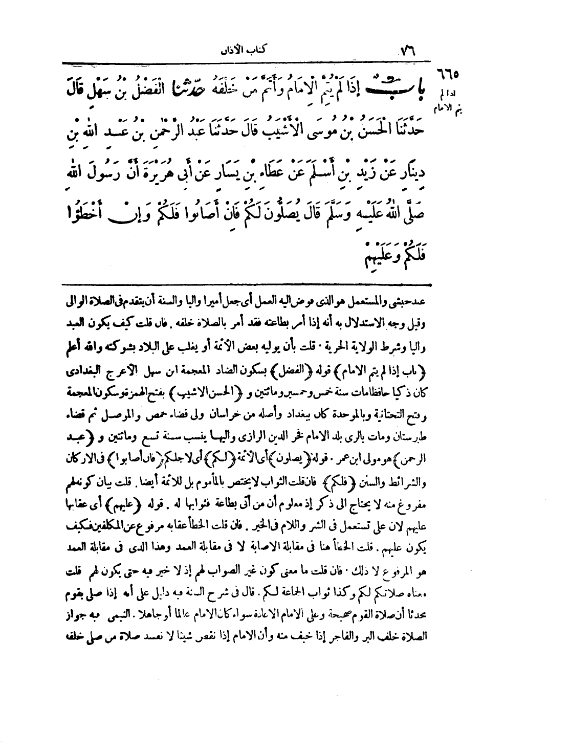 665 - حَدَّثَنَا الْفَضْلُ بْنُ سَهْلٍ قَالَ: حَدَّثَنَا الْحَسَنُ بْنُ مُوسَى الأَشْيَبُ قَالَ: حَدَّثَنَا عَبْدُ الرَّحْمَنِ بْنُ عَبْدِ اللهِ بْنِ دِينَارٍ، عَنْ زَيْدِ بْنِ أَسْلَمَ، عَنْ عَطَاءِ بْنِ يَسَارٍ، عَنْ أَبِي هُرَيْرَةَ، أَنَّ رَسُولَ اللهِ صلى الله عليه وسلم قَالَ: يُصَلُّونَ لَكُمْ فَإِنْ أَصَابُوا فَلَكُمْ وَإِنْ أَخْطَؤُوا فَلَكُمْ وَعَلَيْهِمْ.