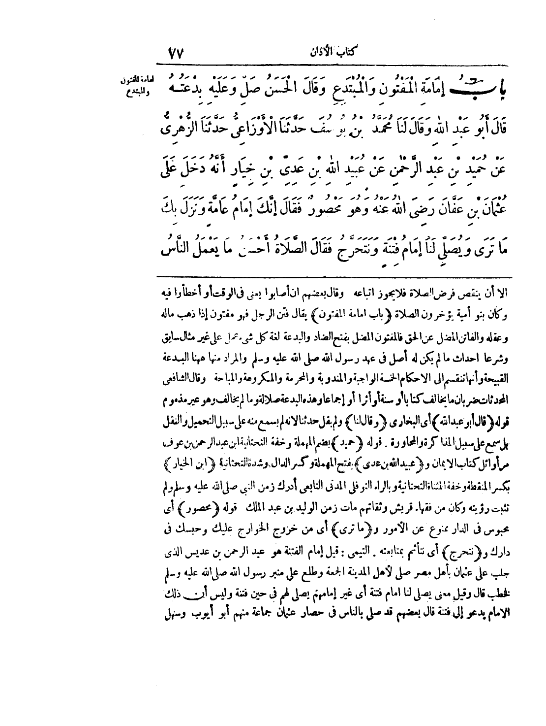إلا أن ينقص فرض الصلاة فلا يجوز اتباعه وقال بعضهم أن أصابوا يعني في الوقت أو أخطاراً فيه وكان بنو أمية يؤخرون الصلاة (باب أمامة المفتون) يقال فتن الرجل فهو مفتون إذا ذهب ماله وعقله والفاتن المضل بفتح الضاد والبدعة لغة كل شئ عمل على غير مثال سابق وشرعاً أحداث ما لم يكن له أصل في عهد رسول الله صلى الله عليه وسلّم والمراد منها ههنا البدعة القبيحة وأنها تنقسم إلى الأحكام الخمسة الواجبة والمندوبة والمحرمة والمكروهة والمباحة وقال الشافعي المحدثات ضربان ما يخالف كتاباً أو سنة أو أثراً أو إجماعاً وهذه البدعة ضلالة وما لم يخالف وهو غير مذموم قوله (قال أبو عبد الله) أي البخاري (وقال لنا) ولم يقل حدثنا لأنه لم يسمع منه على سبيل التحميل والنقل بل سمع على سبيل المذاكرة والمحاورة. قوله (حميد) بضم المهملة وخفة التحتانية ابن عبد الرحمن بن عوف مر أوائل كتاب الإيمان و (عبيد الله بن عدي) بفتح المهملة وكسر الدال وشدة التحتانية (ابن الخيار) بكسر المنقطة وخفة المثناة التحتانية وبالراء النوفلي المدني التابعي أدرك زمن النبي صلى الله عليه وسلّم ولم تثبت رؤيته وكان من فقهاء قريش وثقاتهم مات زمن الوليد بن عبد الملك قوله (محصور) أي محبوس في الدار ممنوع عن الأمور و (ما ترى) أي من خروج الخوارج عليك وحبسك في دارك و (نتحرج) أي نتأثم بمتابعته. التيمي: قيل إمام الفتنة هو عبد الرحمن بن عديس الذي جلب على عثمان بأهل مصر صلى لأهل المدينة الجمعة وطلع على منبر رسول الله صلى الله عليه وسلّم فخطب قال وقيل معنى يصلي لنا أمام فتنة أي غير إمامهم يصلي لهم في حين فتنة وليس أن ذلك الإمام يدعو إلى فتنة قال بعضهم قد صلى بالناس في حصار عثمان جماعة منهم أبو أيوب وسهل