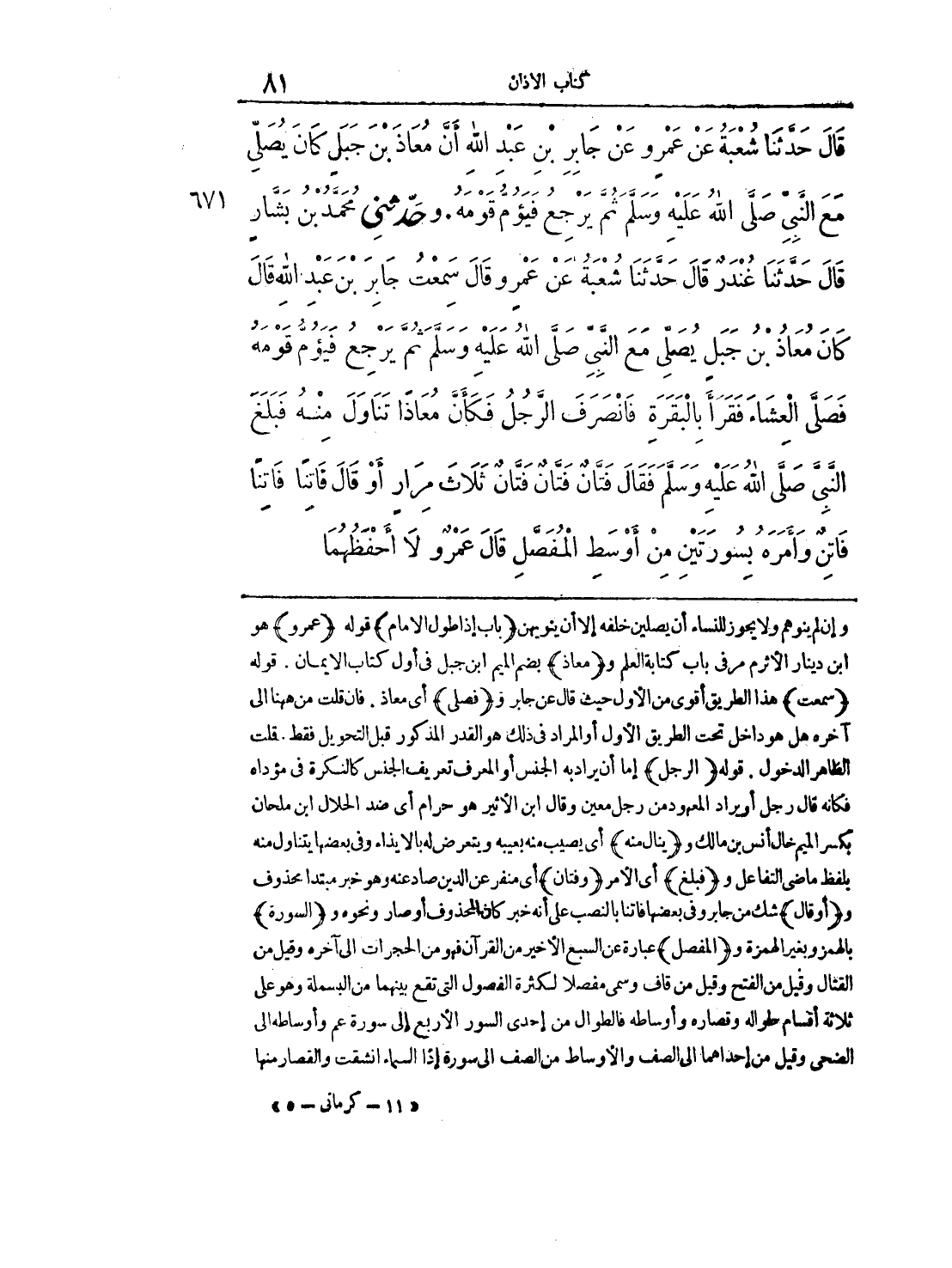 قَالَ: حَدَّثَنَا شُعْبَةُ، عَنْ عَمْرٍو عَنْ جَابِرِ بْنِ عَبْدِ اللهِ أَنَّ مُعَاذَ بْنَ جَبَلٍ كَانَ يُصَلِّي مَعَ النَّبِيِّ صلى الله عليه وسلم ثُمَّ يَرْجِعُ فَيَؤُمُّ قَوْمَهُ.