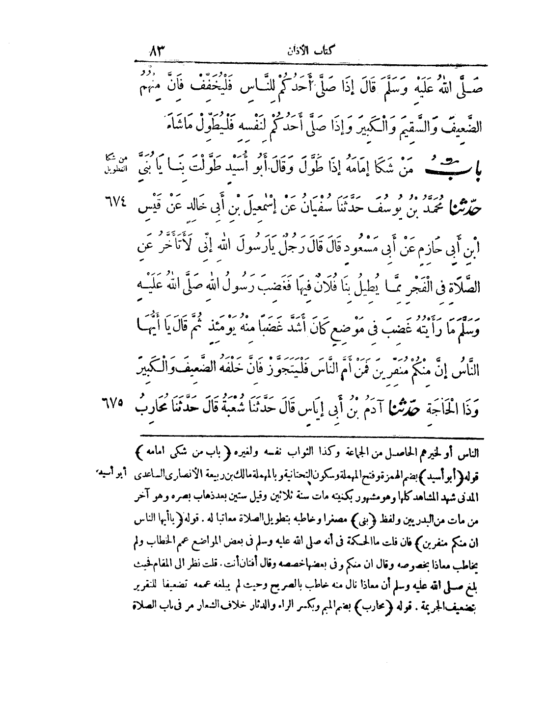 674 - حَدَّثَنَا مُحَمَّدُ بْنُ يُوسُفَ، حَدَّثَنَا سُفْيَانُ، عَنْ إِسْمَاعِيلَ بْنِ أَبِي خَالِدٍ عَنْ قَيْسِ بْنِ أَبِي حَازِمٍ، عَنْ أَبِي مَسْعُودٍ قَالَ: قَالَ رَجُلٌ يَا رَسُولَ اللهِ إِنِّي لأَتَأَخَّرُ، عَنِ الصَّلاَةِ فِي الْفَجْرِ مِمَّا يُطِيلُ بِنَا فُلاَنٌ فِيهَا فَغَضِبَ رَسُولُ اللهِ صلى الله عليه وسلم مَا رَأَيْتُهُ غَضِبَ فِي مَوْضِعٍ كَانَ أَشَدَّ غَضَبًا مِنْهُ يَوْمَئِذٍ ثُمَّ قَالَ يَا أَيُّهَا النَّاسُ إِنَّ مِنْكُمْ مُنَفِّرِينَ فَمَنْ أَمَّ النَّاسَ فَلْيَتَجَوَّزْ فَإِنَّ خَلْفَهُ الضَّعِيفَ وَالْكَبِيرَ وَذَا الْحَاجَة.