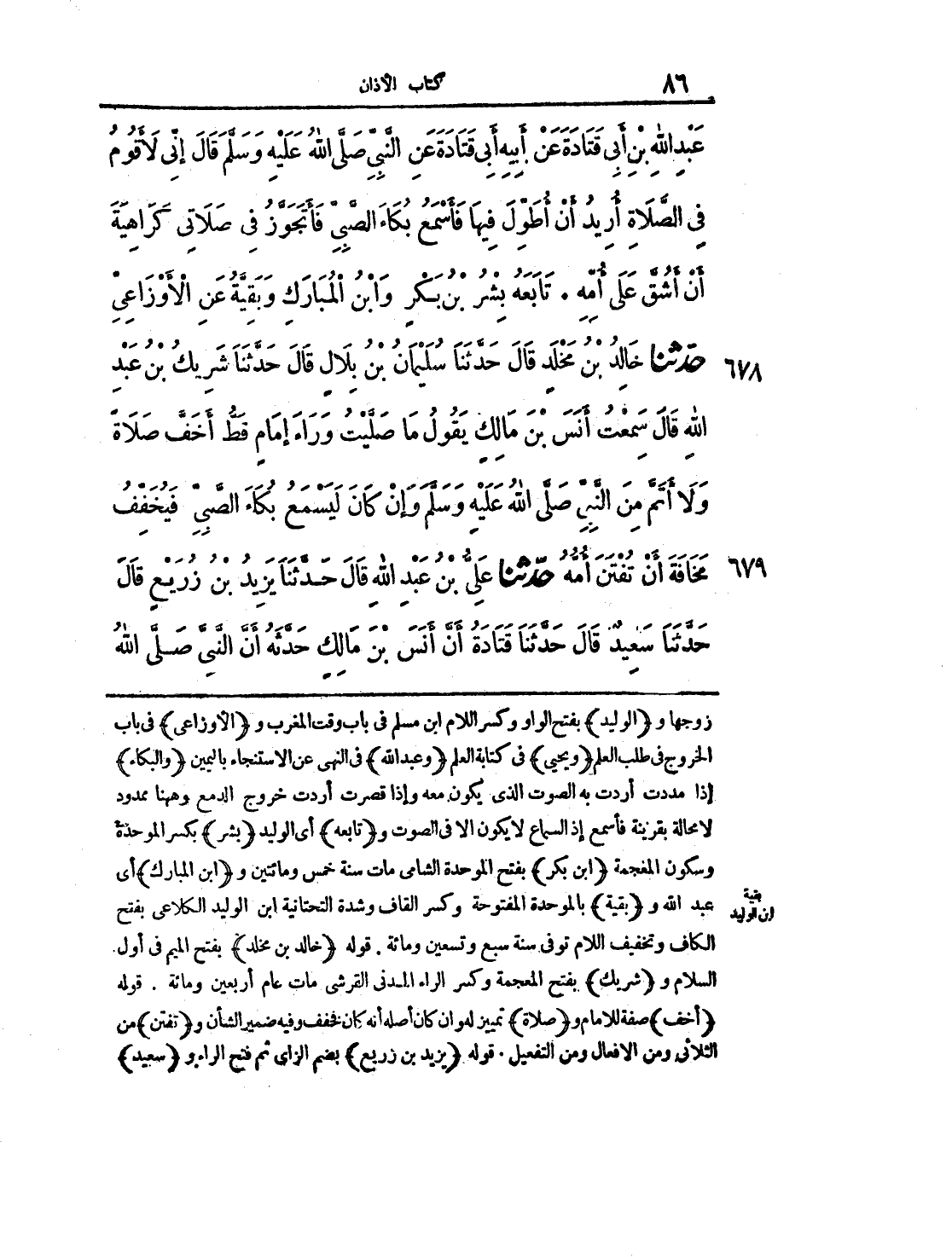 678 - حَدَّثَنَا خَالِدُ بْنُ مَخْلَدٍ قَالَ: حَدَّثَنَا سُلَيْمَانُ بْنُ بِلاَلٍ قَالَ: حَدَّثَنَا شَرِيكُ بْنُ عَبْدِ اللهِ، قَالَ: سَمِعْتُ أَنَسَ بْنَ مَالِكٍ يَقُولُ مَا صَلَّيْتُ وَرَاءَ إِمَامٍ قَطُّ أَخَفَّ صَلاَةً، وَلاَ أَتَمَّ مِنَ النَّبِيِّ صلى الله عليه وسلم وَإِنْ كَانَ لَيَسْمَعُ بُكَاءَ الصَّبِيِّ فَيُخَفِّفُ مَخَافَةَ أَنْ تُفْتَنَ أُمُّهُ.