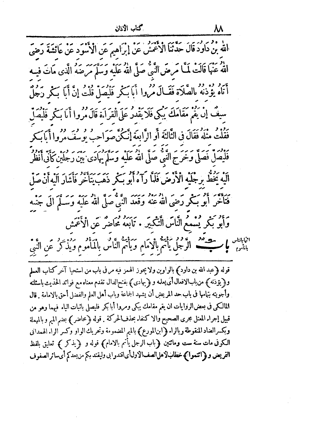 اللهِ بْنُ دَاوُدَ قَالَ: حَدَّثَنَا الأَعْمَشُ، عَنْ إِبْرَاهِيمَ، عَنِ الأَسْوَدِ، عَنْ عَائِشَةَ، رَضِيَ اللَّهُ عَنْهَا، قَالَتْ لَمَّا مَرِضَ النَّبِيُّ صلى الله عليه وسلم مَرَضَهُ الَّذِي مَاتَ فِيهِ أَتَاهُ بِلاَلٌ يُؤْذِنُهُ بِالصَّلاَةِ فَقَالَ مُرُوا أَبَا بَكْرٍ فَلْيُصَلِّ قُلْتُ إِنَّ أَبَا بَكْرٍ رَجُلٌ أَسِيفٌ إِنْ يَقُمْ مَقَامَكَ يَبْكِي فَلاَ يَقْدِرُ عَلَى الْقِرَاءَةِ قَالَ مُرُوا أَبَا بَكْرٍ فَلْيُصَلِّ فَقُلْتُ مِثْلَهُ فَقَالَ فِي الثَّالِثَةِ، أَوِ الرَّابِعَةِ إِنَّكُنَّ صَوَاحِبُ يُوسُفَ مُرُوا أَبَا بَكْرٍ فَلْيُصَلِّ فَصَلَّى وَخَرَجَ النَّبِيُّ صلى الله عليه وسلم يُهَادَى بَيْنَ رَجُلَيْنِ كَأَنِّي أَنْظُرُ إِلَيْهِ يَخُطُّ بِرِجْلَيْهِ الأَرْضَ فَلَمَّا رَآهُ أَبُو بَكْرٍ ذَهَبَ يَتَأَخَّرُ فَأَشَارَ إِلَيْهِ أَنْ صَلِّ فَتَأَخَّرَ أَبُو بَكْرٍ، رَضِيَ اللَّهُ عَنْهُ، وَقَعَدَ النَّبِيُّ صلى الله عليه وسلم إِلَى جَنْبِهِ، وَأَبُو بَكْرٍ يُسْمِعُ النَّاسَ التَّكْبِيرَ. تَابَعَهُ مُحَاضِرٌ، عَنِ الأَعْمَشِ.