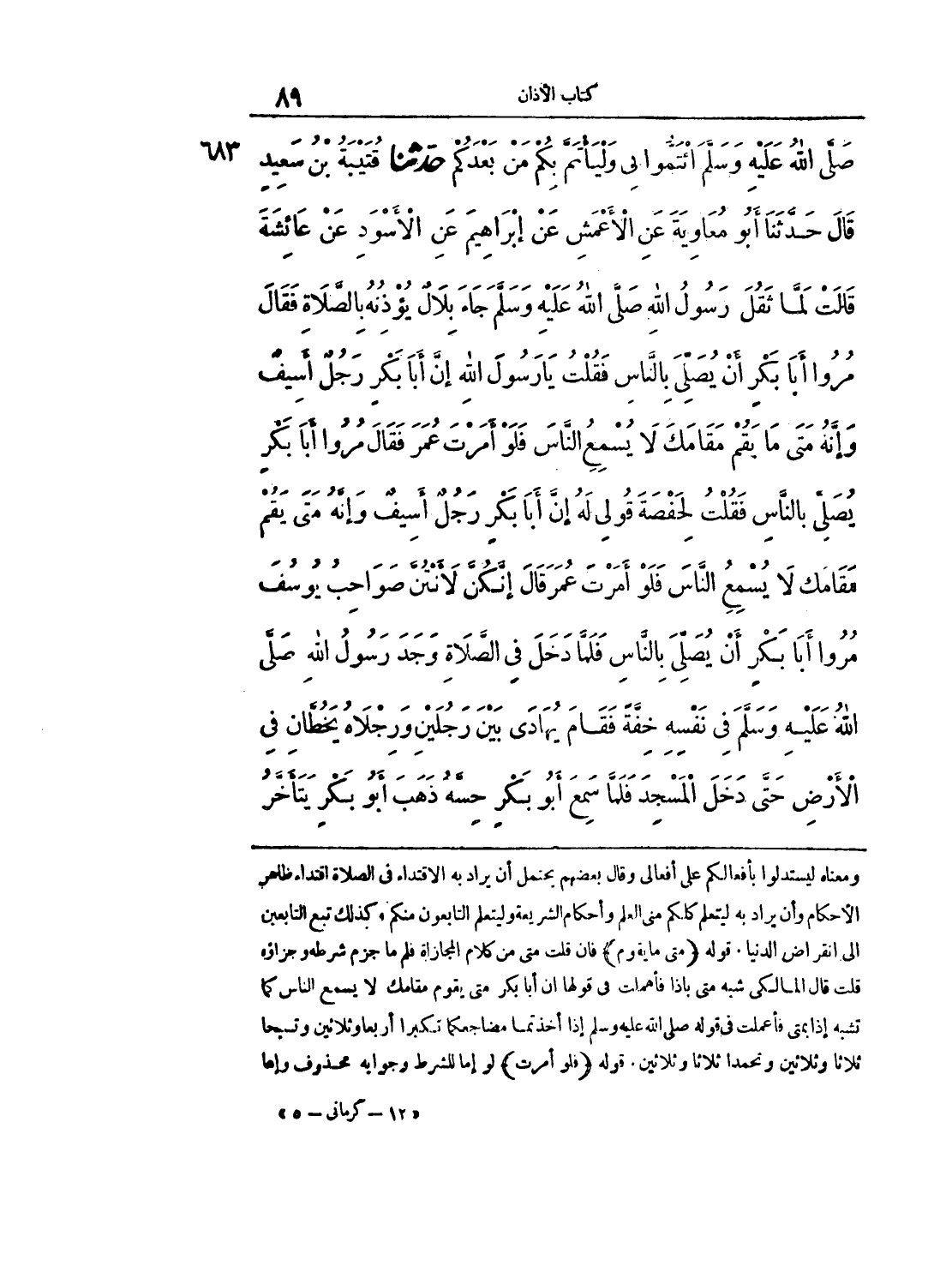 683 - حَدَّثَنَا قُتَيْبَةُ بْنُ سَعِيدٍ، قَالَ: حَدَّثَنَا أَبُو مُعَاوِيَةَ، عَنِ الأَعْمَشِ، عَنْ إِبْرَاهِيمَ، عَنِ الأَسْوَدِ، عَنْ عَائِشَةَ، قَالَتْ: لَمَّا ثَقُلَ رَسُولُ اللَّهِ صَلَّى اللهُ عَلَيْهِ وَسَلَّمَ جَاءَ بِلاَلٌ يُوذِنُهُ بِالصَّلاَةِ، فَقَالَ: «مُرُوا أَبَا بَكْرٍ أَنْ يُصَلِّيَ بِالنَّاسِ»، فَقُلْتُ: يَا رَسُولَ اللَّهِ إِنَّ أَبَا بَكْرٍ رَجُلٌ أَسِيفٌ وَإِنَّهُ مَتَى مَا يَقُمْ مَقَامَكَ لاَ يُسْمِعُ النَّاسَ، فَلَوْ أَمَرْتَ عُمَرَ، فَقَالَ: «مُرُوا أَبَا بَكْرٍ يُصَلِّي بِالنَّاسِ» فَقُلْتُ لِحَفْصَةَ: قُولِي لَهُ: إِنَّ أَبَا بَكْرٍ رَجُلٌ أَسِيفٌ، وَإِنَّهُ مَتَى يَقُمْ مَقَامَكَ لاَ يُسْمِعُ النَّاسَ، فَلَوْ أَمَرْتَ عُمَرَ، قَالَ: «إِنَّكُنَّ لَأَنْتُنَّ صَوَاحِبُ يُوسُفَ، مُرُوا أَبَا بَكْرٍ أَنْ يُصَلِّيَ بِالنَّاسِ» فَلَمَّا دَخَلَ فِي الصَّلاَةِ وَجَدَ رَسُولُ اللَّهِ صَلَّى اللهُ عَلَيْهِ وَسَلَّمَ فِي نَفْسِهِ خِفَّةً، فَقَامَ يُهَادَى بَيْنَ رَجُلَيْنِ، وَرِجْلاَهُ يَخُطَّانِ فِي الأَرْضِ، حَتَّى دَخَلَ المَسْجِدَ، فَلَمَّا سَمِعَ أَبُو بَكْرٍ حِسَّهُ، ذَهَبَ أَبُو بَكْرٍ يَتَأَخَّرُ، ْ»