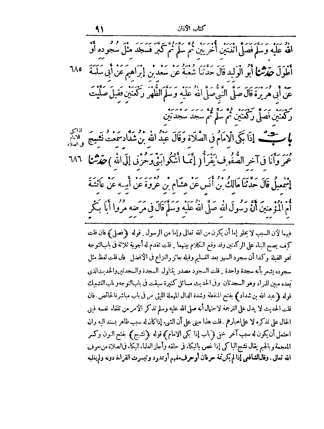 فيهما لأن السبب لا يخلو إما أن يكون من الله تعالى وإما من الرسول. قوله (فصلى) فإن قلت كيف يصح البناء على الركعتين وقد وقع الكلام بينهما. قلت تقدم له أجوبة ثلاثة في باب التوجه نحو القبلة وكذا أن سجود السهو بعد التسليم وقبله جائز والنزاع في الأفضل فإن قلت لفظ مثل سجوده يشعر بأنه سجدة واحدة. قلت السجود مدر يتناول السجدة والسجدتين والحديث الذي بعده مبين للمراد وهو السجدتان وفي الحديث مسائل كثيرة سبقت في باب التوجه وباب التشبيك قوله (عبد الله بن شداد) بفتح المنقطة وشدة الدال المهملة الليثي مر في باب مباشرة الحائض. فإن قلت الحديث لا يدل على الترجمة لاحتمال أنه صلى الله عليه وسلم تذكر الأمر من تلقاء نفسه فبنى الحال على تذكره لا على إخبارهم. قلت هذا مبني على أن الشئ إذا كان له سبب ظاهر يسند إليه وإن احتمل أن يكون له سبب آخر خفي (باب إذا بكى الإمام) قوله (نشيج) بفتح النون وكسر المعجمة وبالجيم يقال نشج الباكي إذا غص بالبكاء في حلقه وأجاز العلماء البكاء في الصلاة من خوف الله تعالى. وقال الشافعي إذا لم يكن ثمة حرفان أو حرف مفهم أو ممدود وتيسرت القراءة دونه ولم يغلبه