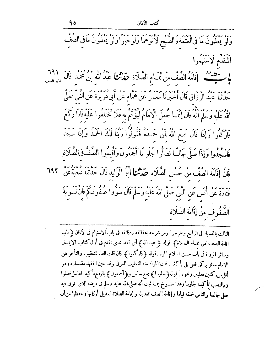 691 - حَدَّثَنَا عَبْدُ اللهِ بْنُ مُحَمَّدٍ قَالَ: حَدَّثَنَا عَبْدُ الرَّزَّاقِ قَالَ: أَخْبَرَنَا مَعْمَرٌ، عَنْ هَمَّامٍ، عَنْ أَبِي هُرَيْرَةَ، عَنِ النَّبِيِّ صلى الله عليه وسلم أَنَّهُ قَالَ إِنَّمَا جُعِلَ الإِمَامُ لِيُؤْتَمَّ بِهِ فَلاَ تَخْتَلِفُوا عَلَيْهِ فَإِذَا رَكَعَ فَارْكَعُوا، وَإِذَا قَالَ سَمِعَ اللَّهُ لِمَنْ حَمِدَهُ فَقُولُوا رَبَّنَا لَكَ الْحَمْدُ، وَإِذَا سَجَدَ فَاسْجُدُوا، وَإِذَا صَلَّى جَالِسًا فَصَلُّوا جُلُوسًا أَجْمَعُونَ وَأَقِيمُوا الصَّفَّ فِي الصَّلاَةِ فَإِنَّ إِقَامَةَ الصَّفِّ مِنْ حُسْنِ الصَّلاَةِ.