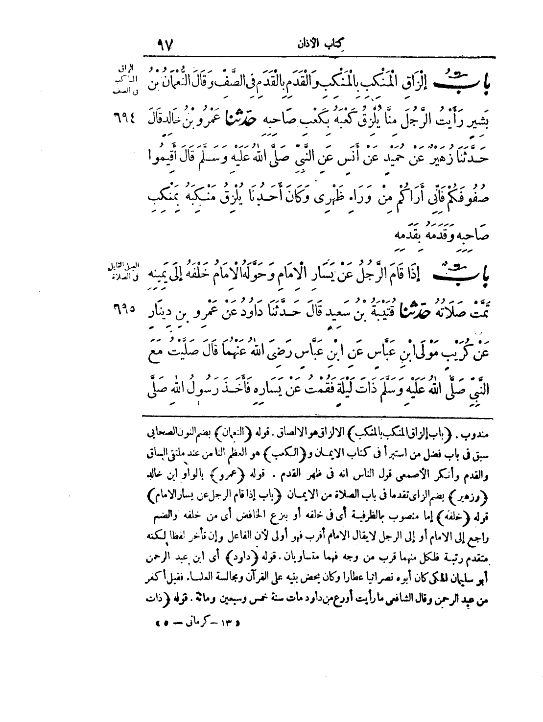 مندوب. (باب إلزاق المنكب بالمنكب) الإلزاق هو الإلصاق. قوله (النعمان) بضم النون الصحابي سبق في باب فضل من استبرأ في كتاب الإيمان و (الكعب) هو العظم النا من عند ملتقى الساق والقدم وأنكر الأصمعي قول الناس أنه في ظهر القدم. قوله (عمرو) بالواو ابن خالد (وزهير) بضم الزاي تقدما في باب الصلاة من الإيمان (باب إذا قام الرجل عن يسار الإمام) قوله (لفه) إما منصوب بالظرفية أي في خلفه أو بنزع الخافض أي من خلفه والضم راجع إلى الإمام أو إلى الرجل لا يقال الإمام أقرب فهو أولى لأن للفاعل وإن تأخر لفظا لكنه متقدم رتبة فلكل منهما قرب من وجه فهما متساويان. قوله (داود) أي ابن عبد الرحمن أبو سليمان المكي كان أبوه نصرانياً عطاراً وكان يحض بنيه على القرآن ومجالسة العلماء فقيل أكفر من عبد الرحمن وقال الشافعي ما رأيت أروع من داود مات سنة خمس وسبعين ومائة. قوله (ذات