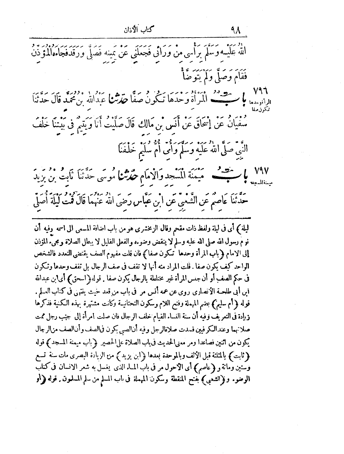 ليلة) أي في ليلة ولفظ ذات مقحم وقال الزمخشري هو من باب إضافة المسمى إلى اسمه وفيه أن نوم رسول الله صلى الله عليه وسلّم لا ينقض وضوءه والفعل القليل لا يبطل الصلاة ومجئ المؤذن إلى الإمام (باب المرأة وحدها تكون صفاً) فإن قلت مفهوم الصف يقتضي التعدد فالشخص الواحد كيف يكون صفاً. قلت المراد منه أنها لا تقف في صيف الرجال بل تقف وحدها وتكون في حكم الصف أو أن جنس المرأة غير مختلطة بالرجال يكون صفاً. قوله (إسحق) أي ابن عبد الله ابن أبي طلحة الأنصاري روى عن عمه أنس مر في باب من قعد حيث ينتهي في كتاب العلم. قوله (أم سليم) بضم المهملة وفتح اللام وسكون التحتانية وكانت مشتهرة بهذه الكنية فذكرها زيادة في التعريف وفيه أن سنة النساء القيام خلف الرجال فإن صلت امرأة إلى جنب رجل تمت صلاتها وعند الكوفيين فسدت صلاة الرجل وفيه أن الصبي يكون في الصف وأن الصف من الرجال يكون من اثنين فصاعدا ومر معنى الحديث في باب الصلاة على الحصير (باب ميمنة المسجد) قوله (ثابت) بالمثلثة قبل الألف وبالموحدة بعدها (ابن يزيد) من الزيادة البصري مات سنة تسع وستين ومائة و (عاصم) أي الأحول مر في باب الماء الذي يغسل به شعر الإنسان في كتاب الوضوء و (الشعبي) بفتح المنقطة وسكون المهملة في باب المسلم من سلم المسلمون. قوله (أو