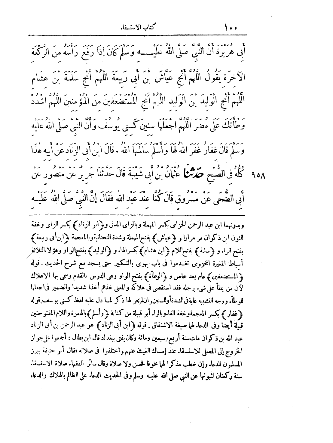 وبدونهما ابن عبد الرحمن الحزامي بكسر المهملة وبالزاي المدني و ((أبو الزناد)) بكسر الزاي وخفة النون ابن ذكوان مر مرارا و ((عياش)) بفتح المهملة وشدة التحتانية وبالمعجمة ((ابن أبي ربيعة)) بفتح الراء و ((سلمة)) بفتح اللام ((ابن هشام)) بكسر الهاء و ((الوليد)) بفتح الواو وهؤلاء الثلاثة أسباط المغيرة المخزومي تقدموا في باب يهوى بالتكبير حتى يسجد مع شرح الحديث، قوله ((المستضعفين)) عام بعد الخاص و ((الوطأة)) بفتح الواو وهي الدوس بالقدم وسمي بها الإهلاك لأن من يطأ على شيء برجله فقد استقصى في هلاكه والمعنى خذهم أخذا شديدا والضمير في اجعلها للوطأة ووجه التشبيه غاية في الشدة أو للسنين وإن لم يجر لها ذكر لما دل عليه لفظ كسني يوسف، قوله ((غفار)) بكسر المعجمة وخفة الفاء وبالراء أبو قبيلة من كنانة ((وأسلم)) بالهمزة واللام المفتوحتين قبيلة أيضا وفي الدعاء لهما صيغة الاشتقاق، قوله ((ابن أبي الزناد)) هو عبد الرحمن بن أبي الزناد عبد الله بن ذكوان مات سنة أربع وسبعين ومائة وكان يفتي ببغداد قال ابن بطال: أجمعوا على جواز الخروج إلى المصلى للاستسقاء عند إمساك الغيث عنهم واختلفوا في صلاته فقال أبو حنيفة يبرز المسلمون للدعاء وإن خطب مذكرا لهما مخوفا فحسن ولا صلاة وقال سائر الفقهاء صلاة الاستسقاء سنة ركعتان لثبوتها عن النبي صلى الله عليه وسلم وفي الحديث الدعاء على الظالم بالهلاك والدعاء