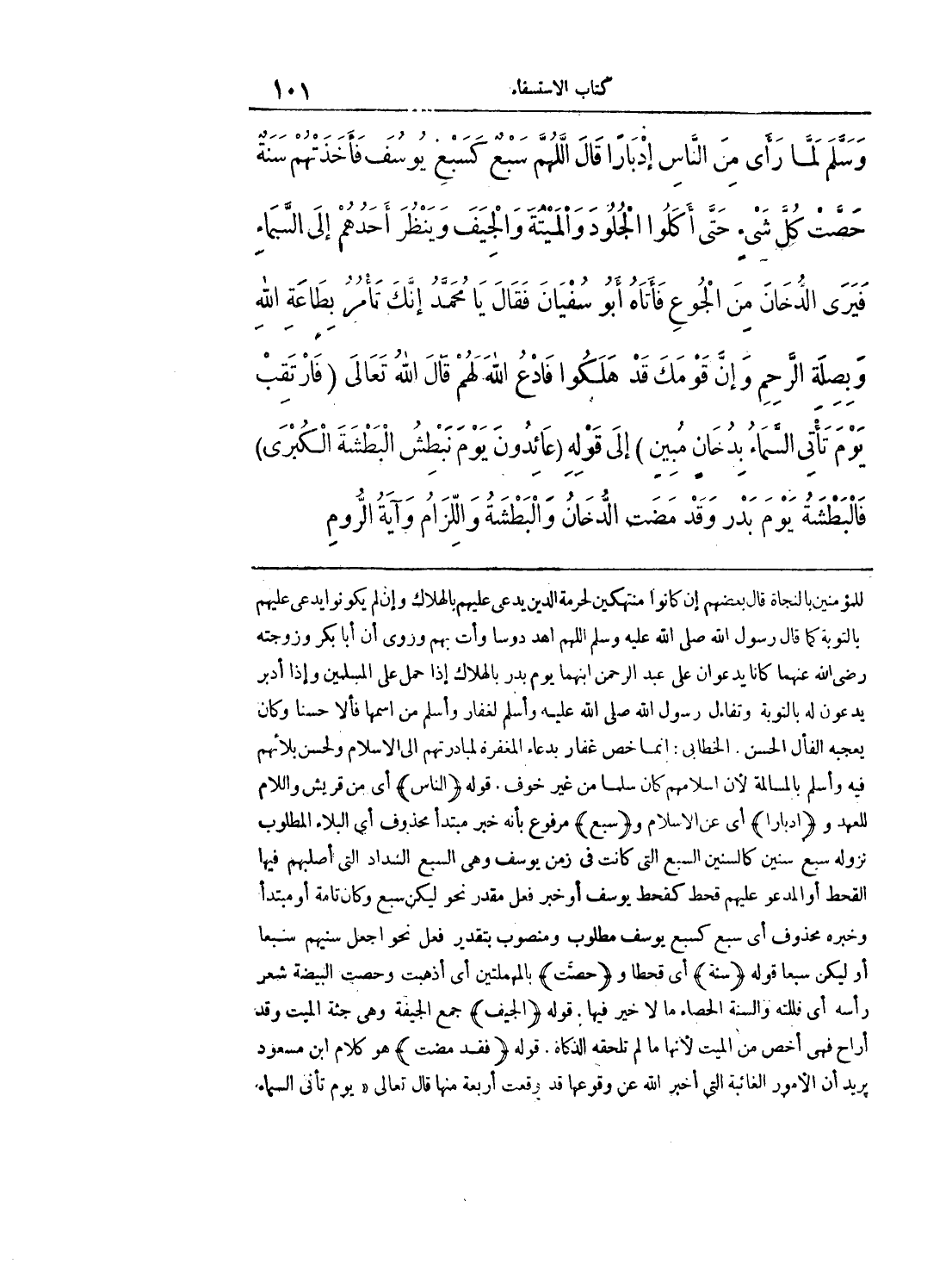وَسَلَّمَ لَمَّا رَأَى مِنْ النَّاسِ إِدْبَارًا قَالَ اللَّهُمَّ سَبْعٌ كَسَبْعِ يُوسُفَ فَأَخَذَتْهُمْ سَنَةٌ حَصَّتْ كُلَّ شَيْءٍ حَتَّى أَكَلُوا الْجُلُودَ وَالْمَيْتَةَ وَالْجِيَفَ وَيَنْظُرَ أَحَدُهُمْ إِلَى السَّمَاءِ فَيَرَى الدُّخَانَ مِنْ الْجُوعِ فَأَتَاهُ أَبُو سُفْيَانَ فَقَالَ يَا مُحَمَّدُ إِنَّكَ تَامُرُ بِطَاعَةِ اللَّهِ وَبِصِلَةِ الرَّحِمِ وَإِنَّ قَوْمَكَ قَدْ هَلَكُوا فَادْعُ اللَّهَ لَهُمْ قَالَ اللَّهُ تَعَالَى {فَارْتَقِبْ يَوْمَ تَاتِي السَّمَاءُ بِدُخَانٍ مُبِينٍ} إِلَى قَوْلِهِ {عَائِدُونَ يَوْمَ نَبْطِشُ الْبَطْشَةَ الْكُبْرَى إِنَّا مُنْتَقِمُونَ} فَالْبَطْشَةُ يَوْمَ بَدْرٍ وَقَدْ مَضَتْ الدُّخَانُ وَالْبَطْشَةُ وَاللِّزَامُ وَآيَةُ الرُّومِ