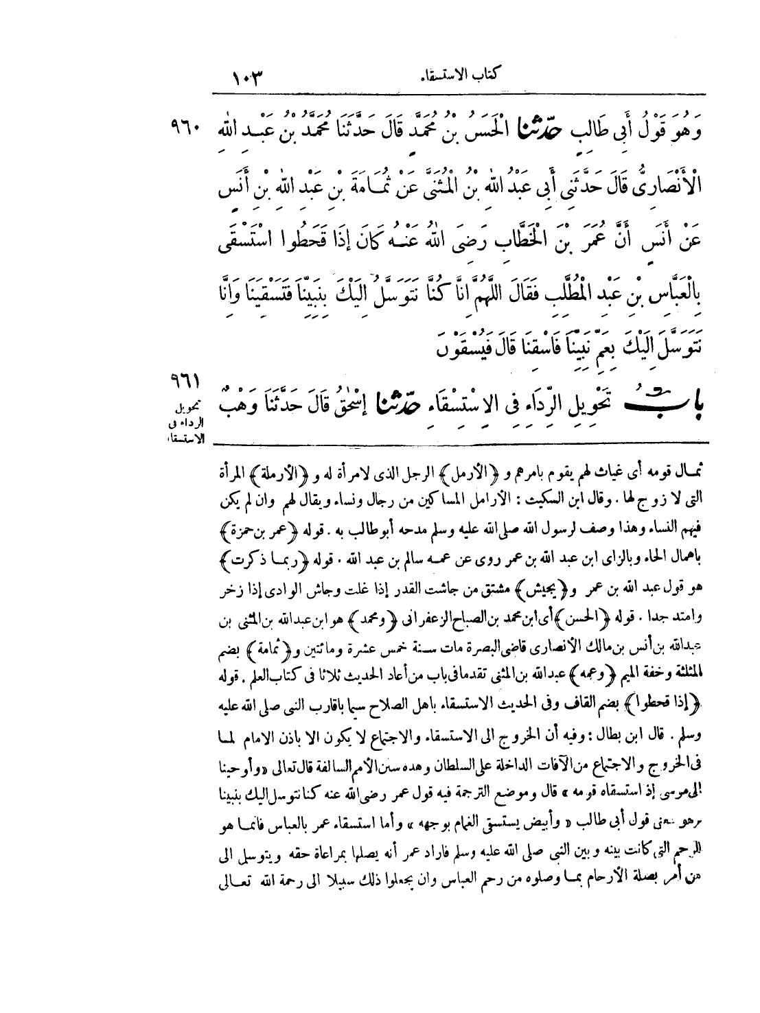 ثمال قوله أي غياث لهم يقوم بأمرهم و ((الأرمل)) الرجل الذي لامرأة له و ((الأرملة)) المرأة التي لا زوج لها, وقال ابن السكيث: الأرامل المساكين من رجال ونساء ويقال لهم وإن لم يكن فيهم النساء وهذا وصف لرسول الله صلى الله عليه وسلم مدحه أبو طالب به, قوله ((عمر بن حمزة)) بإهمال الحاء وبالزاي ابن عبد الله بن عمر روى عن عمه سالم بن عبد الله , قوله ((ربما ذكرت)) هو قول عبد الله بن عمر و ((يجيش)) مشتق من جاشت القدر إذا غلت وجاش الوادي إذا زخر وامتد جدا, قوله ((الحسن)) أي ابن محمد بن الصباح الزعفراني ((ومحمد)) هو ابن عبد الله بن المثنى بن عبد الله بن أنس بن مالك الأنصاري قاضي البصرة مات سنة خمس عشرة ومائتين و ((ثمامة)) بضم المثلثة وخفة الميم ((وعمه)) عبد الله بن المثنى تقدما في باب من أعاد الحديث ثلاثا في كتاب العلم, قوله ((إذا قحطوا)) بضم القاف وفي الحديث الاستسقاء بأهل الصلاح سيما بأقارب النبي صلى الله عليه وسلم, قال ابن بطال: وفيه أن خروج إلى الاستسقاء والاجتماع لا يكون إلا بإذن الإمام لما في الخروج والاجتماع من الآفات الداخلة على السلطان وهذه سنن الأمم السالفة قال تعالى «وأوحينا إلى موسى إذا استسقاه قومه» قال وموضع الترجمة فيه قول عمر رضي الله عنه كنا نتوسل إليك بنبينا وهو معنى قول أبي طالب «وأبيض يستسقي الغمام بوجهه» وأما استسقاء عمر بالعباس فإنما هو للرحم التي كانت بينه وبين النبي صلى الله عليه وسلم فأراد عمر أنه يصلها بمراعاة حقه ويتوسل إلى من أمر بصلة الرحم بما وصلوه من رحم العباس وإن يجعلوا ذلك سبيلا إلى رحمة الله تعالى