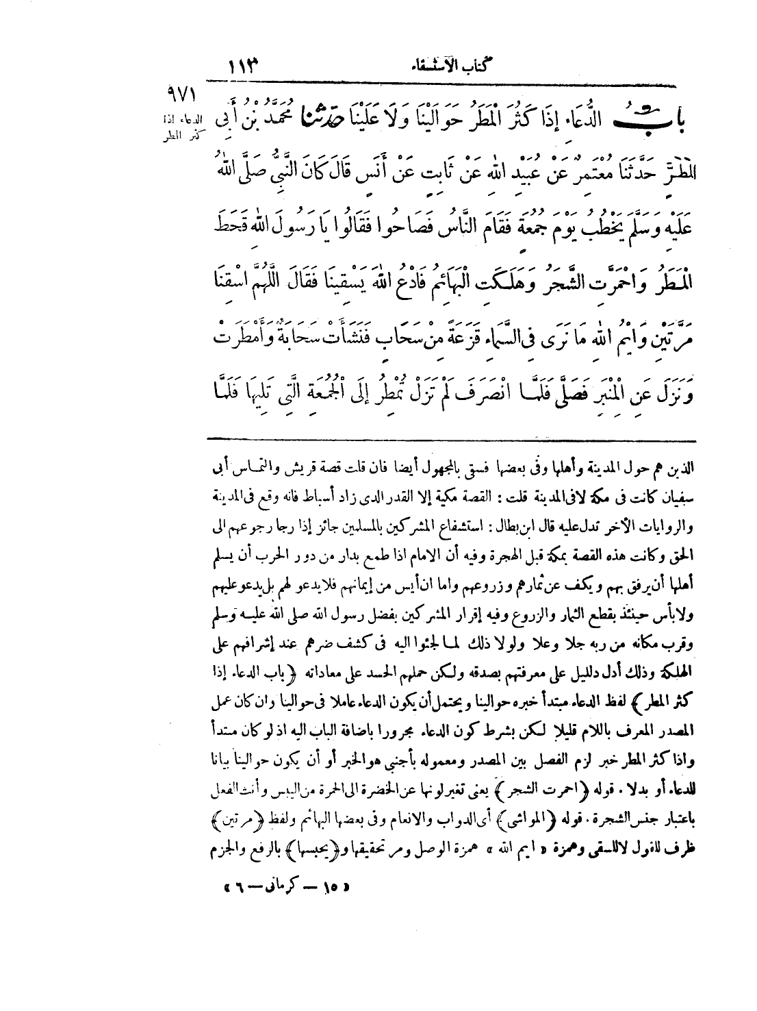 الذين هم حول المدينة وأهلها وفي بعضها فسقي بالمجهول أيضا فإن قلت قصة قريش والتماس أبي سفيان كانت في مكة لا في المدينة قلت: القصة مكية إلا القدر الذي زاد أسباط فإنه وقع في المدينة والروايات الأخر تدل عليه قال ابن بطال: استشفاع المشركين بالمسلمين جائز إذا رجا رجوعهم إلى الحق وكانت هذه القصة بمكة قبل الهجرة وفيه أن الإمام إذا طمع بدار من دور الحرب أن يسلم أهلها أن يرفق بهم ويكف عن ثمارهم وزروعهم وإما أن أيس من إيمانهم فلا يدعو لهم بل يدعو عليهم ولا بأس حينئذ بقطع الثمار والزروع وفيه إقرار المشركين بفضل رسول الله صلى الله عليه وسلم وقرب مكانه من ربه جلا وعلا ولولا ذلك لما لجئوا إليه في كشف ضرهم عند إشرافهم على الهلكة وذلك أدل دليل على معرفتهم بصدقه ولكن حملهم الحسد على معاداته ((باب الدعاء إذا كثر المطر)) لفظ الدعاء مبتدأ خبره حوالينا ويحتمل أن يكون الدعاء عاملا في حوالينا وإن كان عمل المصدر المعرف باللام قليلا لكن بشرط كون الدعاء مجرورا بإضافة الباب إليه إذ لو كان مبتدأ وإذا كثر المطر خبر لزم الفصل بين المصدر ومعمولة بأجنبي هو الخبر أو أن يكون حوالينا بيانا للدعاء أو بدلا, قوله ((احمرت الشجر)) يعني تغير لونها عن الخضرة إلى الحمرة من اليبس وأنث الفعل باعتبار جنس الشجرة, قوله ((المواشي)) أي الدواب والأنعام وفي بعضها البهائم ولفظ ((مرتين)) ظرف للقول لا للسقي وهمزة «أيم الله» همزة الوصل ومر تحقيقها و ((يحبسها)) بالرفع والجزم