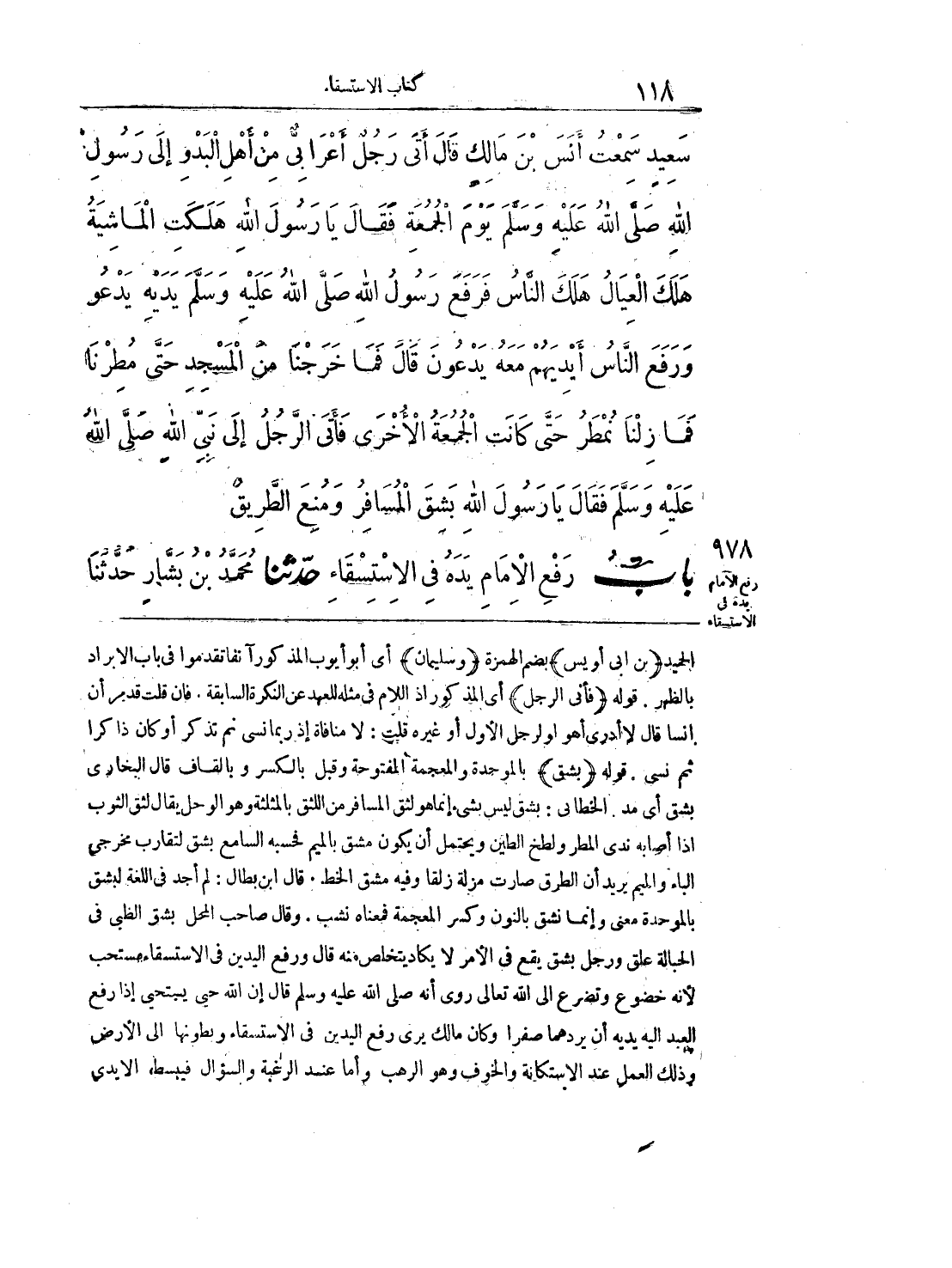 الحميد ((بن أبي أويس)) بضم الهمزة ((وسليمان)) أي أبو أيوب المذكور آنفا تقدموا في باب الابراد بالظهر, قوله ((فأتى الرجل)) أي المذكور إذ اللام في مثله للعهد عن النكرة السابقة, فإن قلت قد مر أن إنسا قال لا أدري أهو أو لرجل الأول أو غيره قلت: لا منافاة إذ ربما نسي ثم تذكر أو كان ذاكرا ثم نسي, وقوله ((بشق)) بالموحدة والمعجمة المفتوحة وقبل بالكسر وبالقاف قال البخاري بشق أي مد, الخطابي: بشق ليس بشيء إنما هو لثق المسافر من اللثق بالمثلثة وهو الوحل يقال لثق الثوب إذا أصابه ندى المطر ولطخ الطين ويحتمل أن يكون مشق بالميم فحسبه السامع بشق لتقارب مخرجي الباء والميم يريد أن الطرق صارت مزلة زلقا وفيه مشق الخط, قال ابن بطال: لم أجد في اللغة لبشق بالموحدة معنى وإنما نشق بالنون وكسر المعجمة فمعناه نشب, وقال صاحب المحل بشق الظبي في الحبالة علق ورجل بشق يقع في الأمر لا يكاد يتخلص منه قال ورفع اليدين في الاستسقاء مستحب لأنه خضوع وتضرع إلى الله تعالى روى أنه صلى الله عليه وسلم قال إن الله حي يستحي إذا رفع العبد إليه يديه أن يردها صفرا وكان مالك يرى رفع اليدين في الاستسقاء وبطونها إلى الأرض وذلك العمل عند الاستكانة والخوف وهو الرهب وأما عند الرغبة والسؤال فيبسط الأيدي