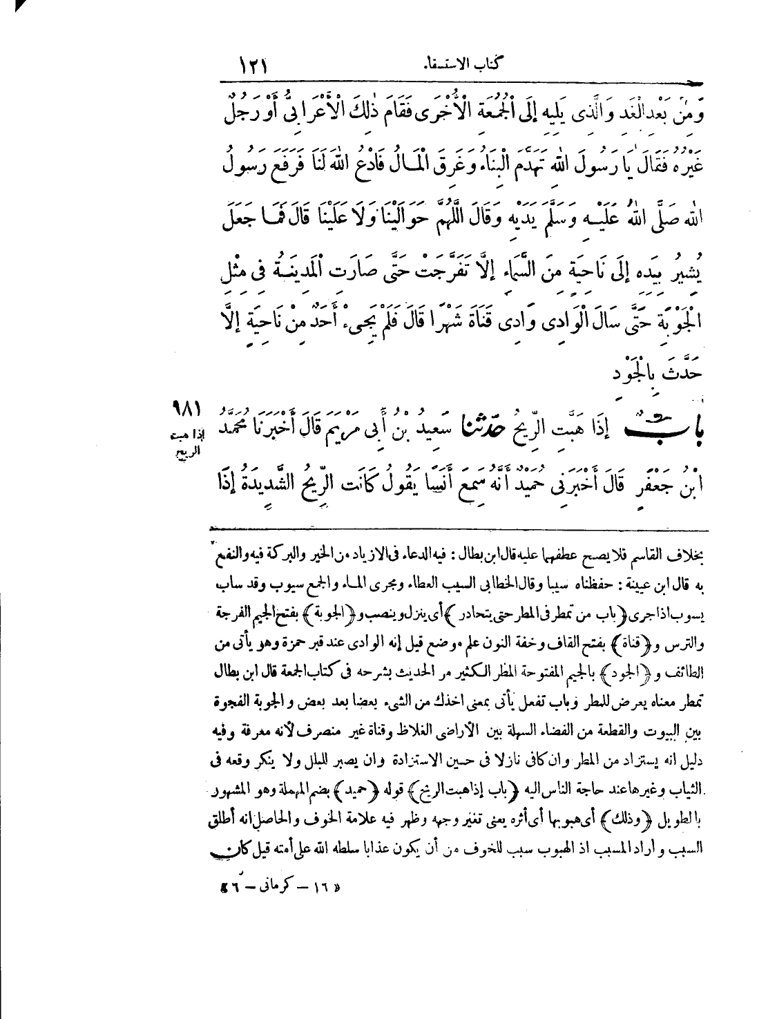 بخلاف القاسم فلا يصح عطفها عليه قال ابن بطال: فيه الدعاء في الازياد من الخير والبركة فيه والنفع به قال ابن عيينة: حفظناه سيبا وقال الخطابي السيب العطاء ومجرى الماء والجمع سيوب وقد ساب يسوب إذا جرى ((باب من تمطر في المطر حتى يتحادر)) أي ينزل وينصب و ((الجوبة)) بفتح الجيم الفرجة والترس و ((قناة)) بفتح القاف وخفة النون علم موضع قيل إنه الوادي عند قبر حمزة وهو يأتي من الطائف و ((الجود)) بالجيم المفتوحة المطر الكثير مر الحديث بشرحه في كتاب الجمعة قال ابن بطال تمطر معناه يعرض للمطر وباب تفعل يأتي بمعنى أخذك من الشيء بعضا بعد بعض والجوبة الفجوة بين البيوت والقطعة من الفضاء السهلة بين الأراضي الغلاظ وقناة غير منصرف لأنه معرفة وفيه دليل أنه يستزاد من المطر وإن كافي نازلا في حين الاستزادة وإن يصبر للبلل ولا ينكر وقعه في الثياب وغيرها عند حاجة الناس إليه ((باب إذا هبت الريح)) قوله ((حميد)) بضم المهملة وهو المشهور بالطويل ((وذلك)) أي هبوبها أي أثره يعني تغير وجهه وظهر فيه علامة الخوف والحاصل أنه أطلق السبب وأراد المسبب إذ الهبوب سبب للخوف من أن يكون عذابا سلطه الله على أمته قيل كان