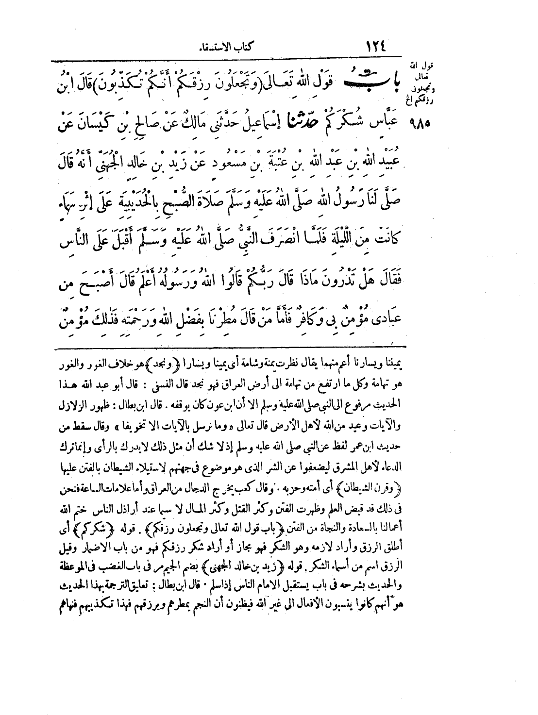 985 - حَدَّثَنَا إِسْمَاعِيلُ حَدَّثَنِي مَالِكٌ عَنْ صَالِحِ بْنِ كَيْسَانَ عَنْ عُبَيْدِ اللَّهِ بْنِ عَبْدِ اللَّهِ بْنِ عُتْبَةَ بْنِ مَسْعُودٍ عَنْ زَيْدِ بْنِ خَالِدٍ الْجُهَنِيِّ أَنَّهُ قَالَ صَلَّى لَنَا رَسُولُ اللَّهِ صَلَّى اللَّهُ عَلَيْهِ وَسَلَّمَ صَلَاةَ الصُّبْحِ بِالْحُدَيْبِيَةِ عَلَى إِثْرِ سَمَاءٍ كَانَتْ مِنْ اللَّيْلَةِ فَلَمَّا انْصَرَفَ النَّبِيُّ صَلَّى اللَّهُ عَلَيْهِ وَسَلَّمَ أَقْبَلَ عَلَى النَّاسِ فَقَالَ هَلْ تَدْرُونَ مَاذَا قَالَ رَبُّكُمْ قَالُوا اللَّهُ وَرَسُولُهُ أَعْلَمُ قَالَ أَصْبَحَ مِنْ عِبَادِي مُؤْمِنٌ بِي وَكَافِرٌ فَأَمَّا مَنْ قَالَ مُطِرْنَا بِفَضْلِ اللَّهِ وَرَحْمَتِهِ فَذَلِكَ مُؤْمِنٌ