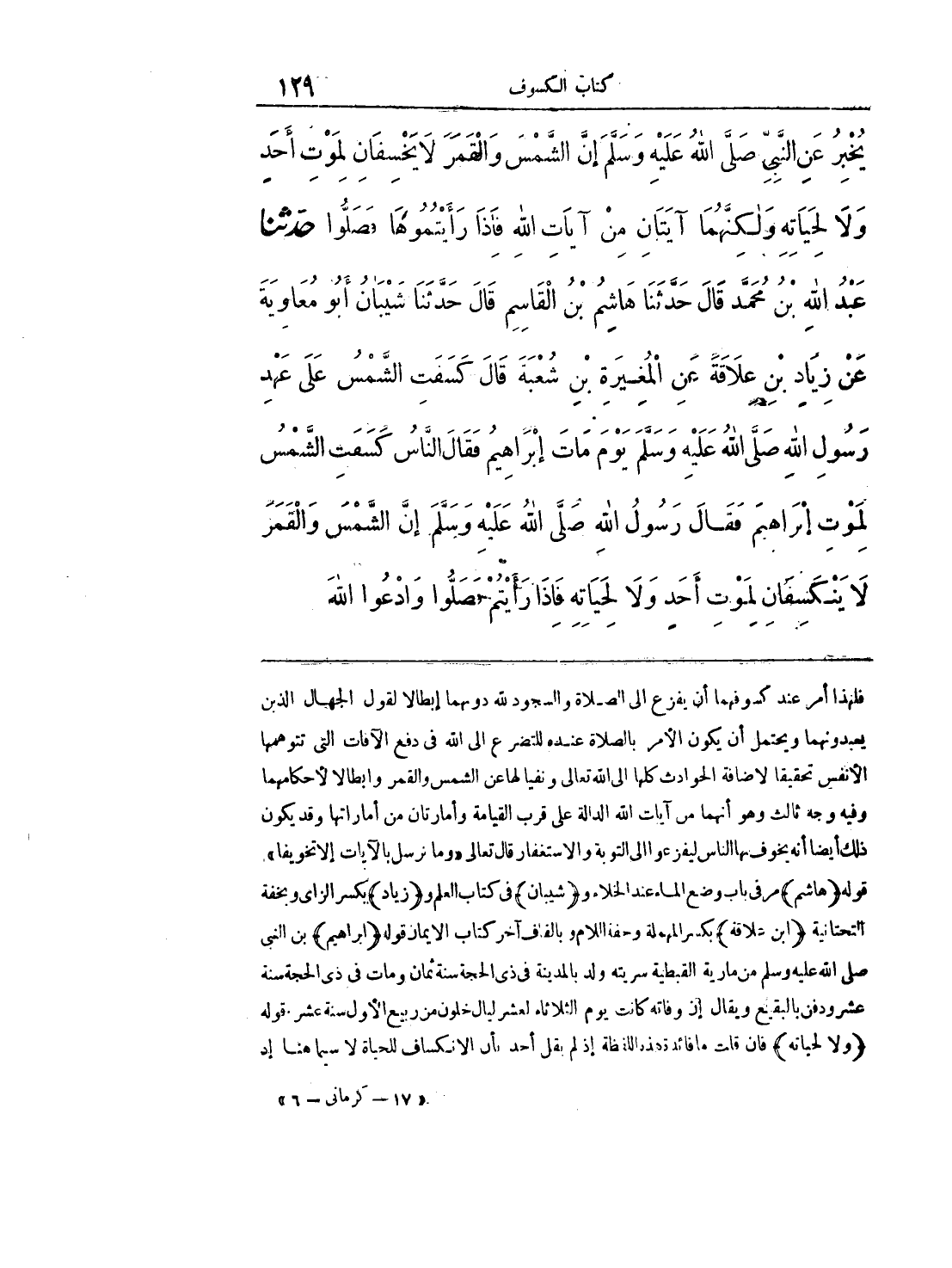 فلهذا أمر عند كسوفهما أن يفزع إلى الصلاة والسجود لله دونهما إبطالا لقول الجهال الذين يعبدونهما ويحتمل أن يكون الأمر بالصلاة عنده للتضرع إلى الله في دفع الآفات التي تتوهمها الأنفس تحقيقا لإضافة الحوادث كلها إلى الله تعالى ونفيا لها عن الشمس والقمر وإبطالا لأحكامهما وفيه وجه ثالث وهو أنهما من آيات الله الدالة على قرب القيامة وأمارتان وقد يكون ذلك أيضا أنه يخوف بها الناس ليفزعوا إلى التوبة والاستغفار قال تعالى «وما نرسل بالآيات إلا تخويفا» قوله ((هاشم)) مر في باب وضع الماء عند الخلاء و ((شيبان)) في كتاب العلم و ((زياد)) بكسر الزاي وبخفة التحتانية ((ابن علاقة)) بكسر المهملة وخفة اللام بالقاف آخر كتاب الإيمان قوله ((إبراهيم)) بن النبي صلى الله عليه وسلم من مارية القبطية سريته ولد بالمدينة في ذي الحجة سنة ثمان ومات في ذي الحجة سنة عشر ودفن بالبقيع ويقال إن وفاته كانت يوم الثلاثاء لعشر ليال خلون من ربيع الأول سنة عشر, قوله ((ولا لحياته)) فإن قلت ما فائدة هذه اللفظة إذ لم يقل أحد بأن الانكساف للحياة لاسيما هنا إذ