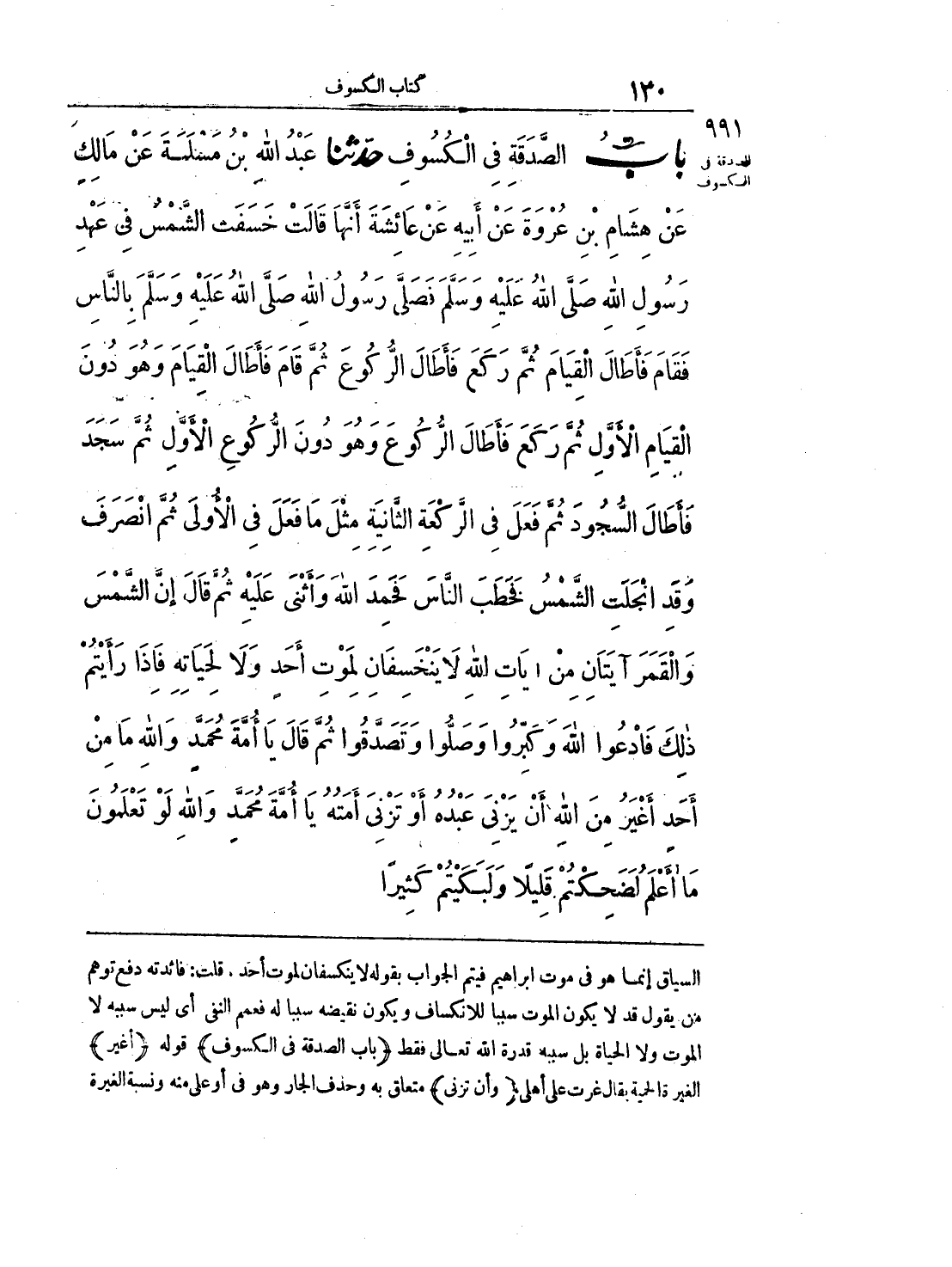 991 - حَدَّثَنَا عَبْدُ اللَّهِ بْنُ مَسْلَمَةَ عَنْ مَالِكٍ عَنْ هِشَامِ بْنِ عُرْوَةَ عَنْ أَبِيهِ عَنْ عَائِشَةَ أَنَّهَا قَالَتْ خَسَفَتْ الشَّمْسُ فِي عَهْدِ رَسُولِ اللَّهِ صَلَّى اللَّهُ عَلَيْهِ وَسَلَّمَ فَصَلَّى رَسُولُ اللَّهِ صَلَّى اللَّهُ عَلَيْهِ وَسَلَّمَ بِالنَّاسِ فَقَامَ فَأَطَالَ الْقِيَامَ ثُمَّ رَكَعَ فَأَطَالَ الرُّكُوعَ ثُمَّ قَامَ فَأَطَالَ الْقِيَامَ وَهُوَ دُونَ الْقِيَامِ الْأَوَّلِ ثُمَّ رَكَعَ فَأَطَالَ الرُّكُوعَ وَهُوَ دُونَ الرُّكُوعِ الْأَوَّلِ ثُمَّ سَجَدَ فَأَطَالَ السُّجُودَ ثُمَّ فَعَلَ فِي الرَّكْعَةِ الثَّانِيَةِ مِثْلَ مَا فَعَلَ فِي الْأُولَى ثُمَّ انْصَرَفَ وَقَدْ انْجَلَتْ الشَّمْسُ فَخَطَبَ النَّاسَ فَحَمِدَ اللَّهَ وَأَثْنَى عَلَيْهِ ثُمَّ قَالَ إِنَّ الشَّمْسَ وَالْقَمَرَ آيَتَانِ مِنْ آيَاتِ اللَّهِ لَا يَخْسِفَانِ لِمَوْتِ أَحَدٍ وَلَا لِحَيَاتِهِ فَإِذَا رَأَيْتُمْ ذَلِكَ فَادْعُوا اللَّهَ وَكَبِّرُوا وَصَلُّوا وَتَصَدَّقُوا ثُمَّ قَالَ يَا أُمَّةَ مُحَمَّدٍ وَاللَّهِ مَا مِنْ أَحَدٍ أَغْيَرُ مِنْ اللَّهِ أَنْ يَزْنِيَ عَبْدُهُ أَوْ تَزْنِيَ أَمَتُهُ يَا أُمَّةَ مُحَمَّدٍ وَاللَّهِ لَوْ تَعْلَمُونَ مَا أَعْلَمُ لَضَحِكْتُمْ قَلِيلًا وَلبَكَيْتُمْ كَثِيرًا