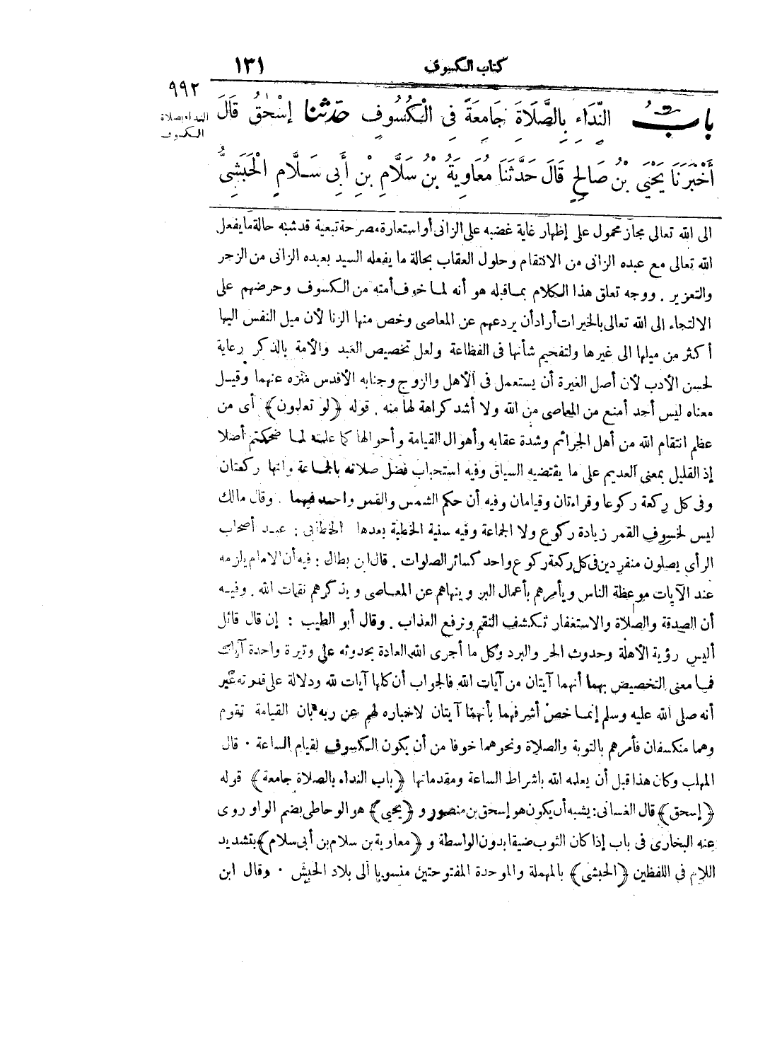 إلى الله تعالى مجاز محمول على إظهار غاية غضبه على الزاني أو استعارة مصرحة تبعية قد شبه حالة ما يفعل الله تعالى مع عبده الزاني من الانتقام وحلول العقاب بحالة ما يفعله السيد بعبده الزاني من الزجر والتعزيز, ووجه تعلق هذا الكلام بما قبله هو أنه لما خوف أمته من الكسوف وحرضهم على الالتجاء إلى الله تعالى بالخيرات أراد أن يردعهم عن المعاصي وخص منها الزنا لأن ميل النفس إليها أكثر من ميلها إلى غيرها ولتفحيم شأنها في الفظاعة ولعل تخصيص العبد والأمة بالذكر رعاية لحسن الأدب لأن أصل الغيرة أن يستعمل في الأهل والزوج وجنابة الأقدس منزه عنهما وقيل معناه ليس أحد أمنع من المعاصي من الله ولا أشد كراهة لها منه, قوله ((لو تعملون)) أي من عظم انتقام الله من أهل الجرائم وشدة عقابه وأهوال القيامة وأحوالها كما علمت لما ضحكتم أصلا إذ القليل بمعنى العديم على ما يقتضيه السياق وفيه استحباب فضل صلاته بالجماعة وإنها ركعتان وفي كل ركعة ركوعا وقراءتان وقيامان وفيه أن حكم الشمس والقمر واحد فيهما, وقال مالك ليس لخسوف القمر زيادة ركوع ولا الجماعة وفيه سنية الخطبة بعدها الخطابي: عبد أصحاب الرأي يصلون منفردين في كل ركعة ركوع واحد كسائر الصلوات, قال ابن بطال: فيه أن الإمام يلزمه عند الآيات موعظة الناس ويأمرهم بأعمال البر وينهاهم عن المعاصي ويذكرهم نقمات الله, وفيه أن الصدقة والصلاة والاستغفار تكشف النقم وترفع العذاب, وقال أبو الطيب: إن قال قائل أليس رؤية الأهلة وحدوث الحر والبرد وكل ما أجرى الله العادة بحدوثه على وتيرة واحدة آيات فما معنى التخصيص بهما أنهما آيتان من آيات الله فالجواب أن كلها آيات الله ودلالة على قدرته غير أنه صلى الله عليه وسلم إنما خص أشرفهما بأنهما آيتان لإخباره لهم عن ربه بأن القيامة تقوم وهما منكسفان فأمرهم بالتوبة والصلاة ونحوهما خوفا من أن يكون الكسوف لقيام الساعة, قال المهلب وكان هذا قبل أن يعلمه الله بإشراط الساعة ومقدماتها ((باب النداء بالصلاة جامعة)) قوله ((إسحق)) قال الغساني: يشبه أن يكون هو إسحق بن منصور و ((يحي)) هو الوحاطي بضم الواو روى عنه البخاري في باب إذا كان الثوب ضيقا بدون الواسطة و ((معاوية بن سلام بن أبي سلام)) بتشديد اللام في اللفظين ((الحبشي)) بالمهملة والموحدة المفتوحتين منسوبا إلى بلاد الحبش, وقال ابن
