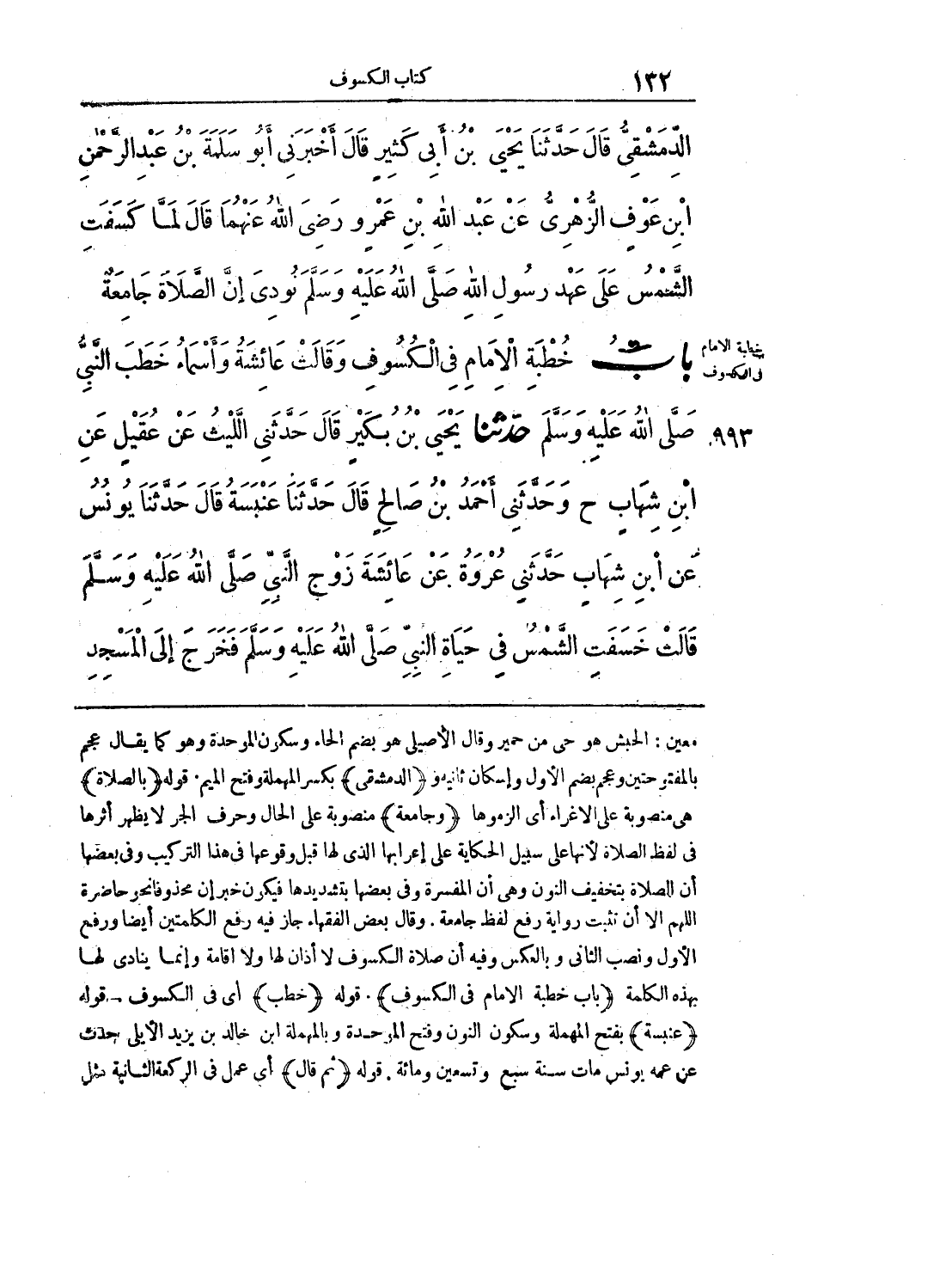 معين: الحبش هو حي من حمير وقال الأصيلي هو بضم الحاء وسكون الموحدة وهو كما يقال عجم بالمفتوحتين وعجم بضم الأول وإسكان الثانية و ((الدمشقي)) بكسر المهملة وفتح الميم, قوله ((بالصلاة)) هي منصوبة على الإغراء أي ألزموها ((وجامعة)) منصوبة على الحال وحرف الجر لا يظهر أثرها في لفظ الصلاة لأنهما على سبيل الحكاية على إعرابها الذي لها قبل وقوعها في هذا التركيب وفي بعضها أن الصلاة بتخفيف النون وهي أن المفسرة وفي بعضها بتشديدها فيكون خبر إن محذوفا نحو حاضرة اللهم إلا أن تثبت رواية رفع لفظ جامعة, وقال بعض الفقهاء جاز فيه رفع الكلمتين أيضا ورفع الأول ونصب الثاني وبالعكس وفيه أن صلاة الكسوف لا أذان لها ولا إقامة وإنما ينادي لها بهذه الكلمة ((باب خطبة الإمام في الكسوف)) ,قوله ((خطب)) أي في الكسوف, قوله ((عنبسة)) بفتح المهملة وسكون النون وفتح الموحدة وبالمهملة ابن خالد بن يزيد الأيلي حدث عن عمه يونس مات سنة سبع وتسعين ومائة, قوله ((ثم قال)) أي عمل في الركعة الثانية مثل